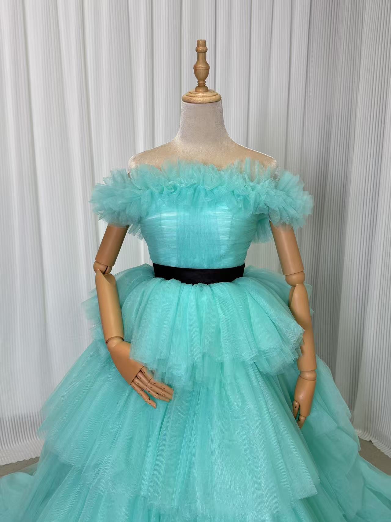 爽やかで優しいブルー カラードレス オフショルダー サッシュベルト ボリュームドレス 可愛い 前撮り