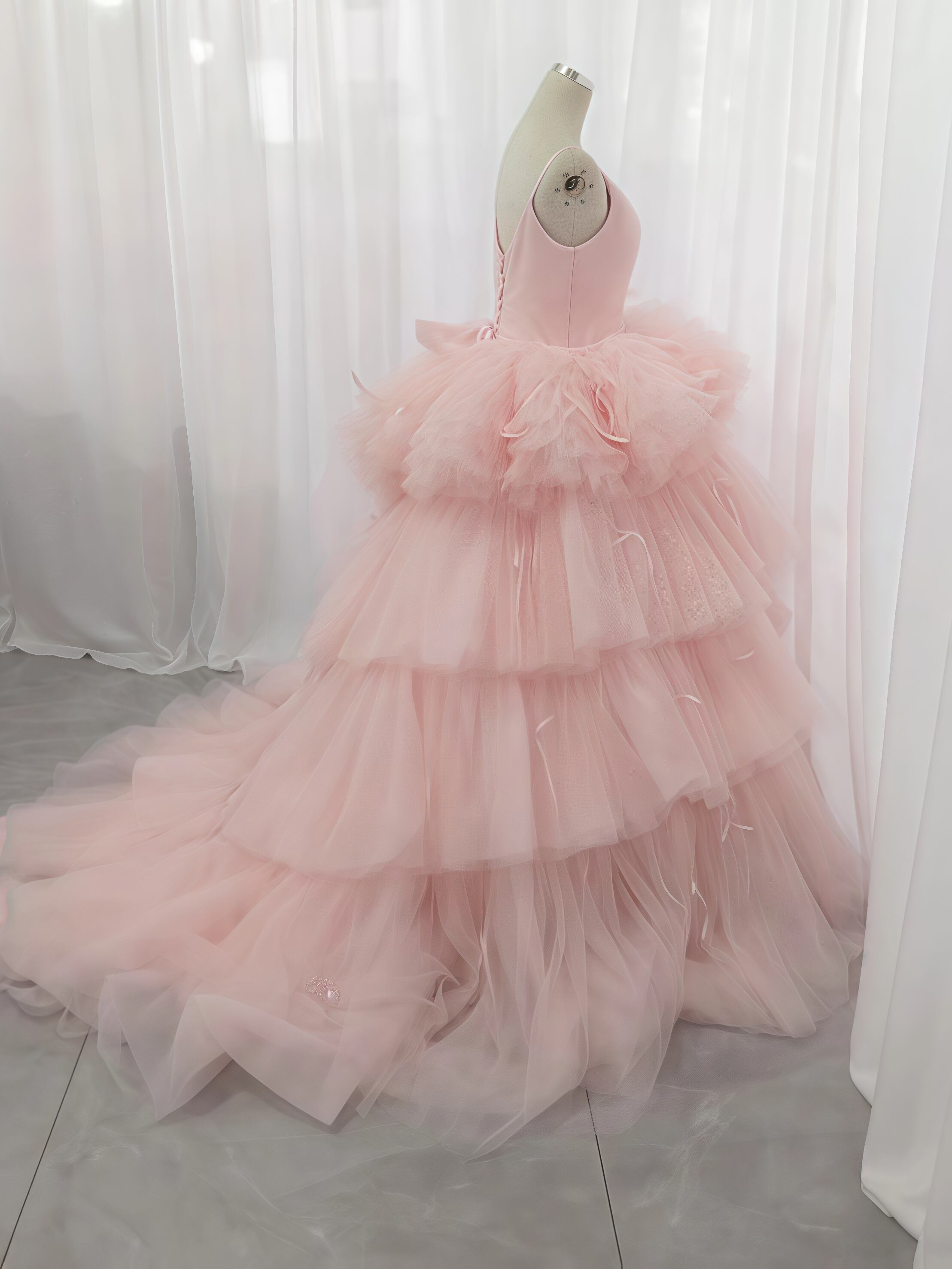 桜色チュールが重なるふんわりフリルのボリュームドレス 蝶結び もこもこティアードカラードレス レースアップ