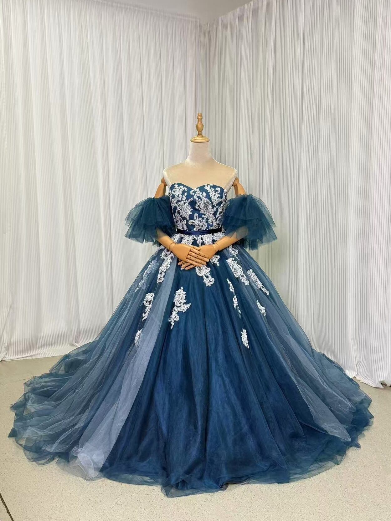 高品質!カラードレス ジュエルブルー ベアトップ フリル袖 キラキラ光る刺繍 優雅なシルエット 編み上げ 前撮り