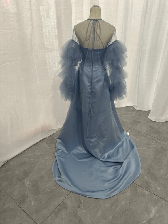 実例写真!パーティードレス ホルターネック ツーピース 水色 光沢サテン 披露宴 前撮り 抜群のおしゃれ見え