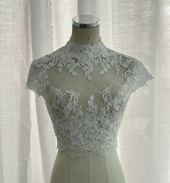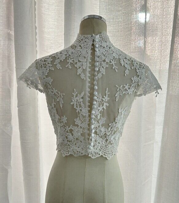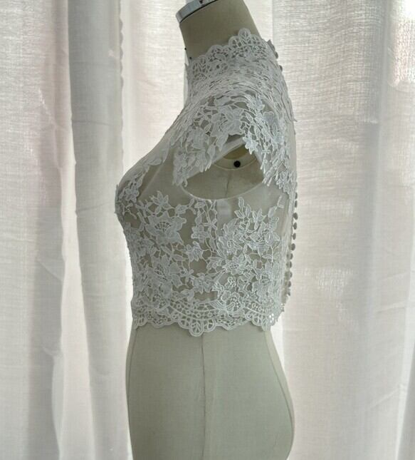 実例写真!ボレロのみ ハイネック 短袖 可憐な花刺繍のトップス くるみボタン フランス風 結婚式