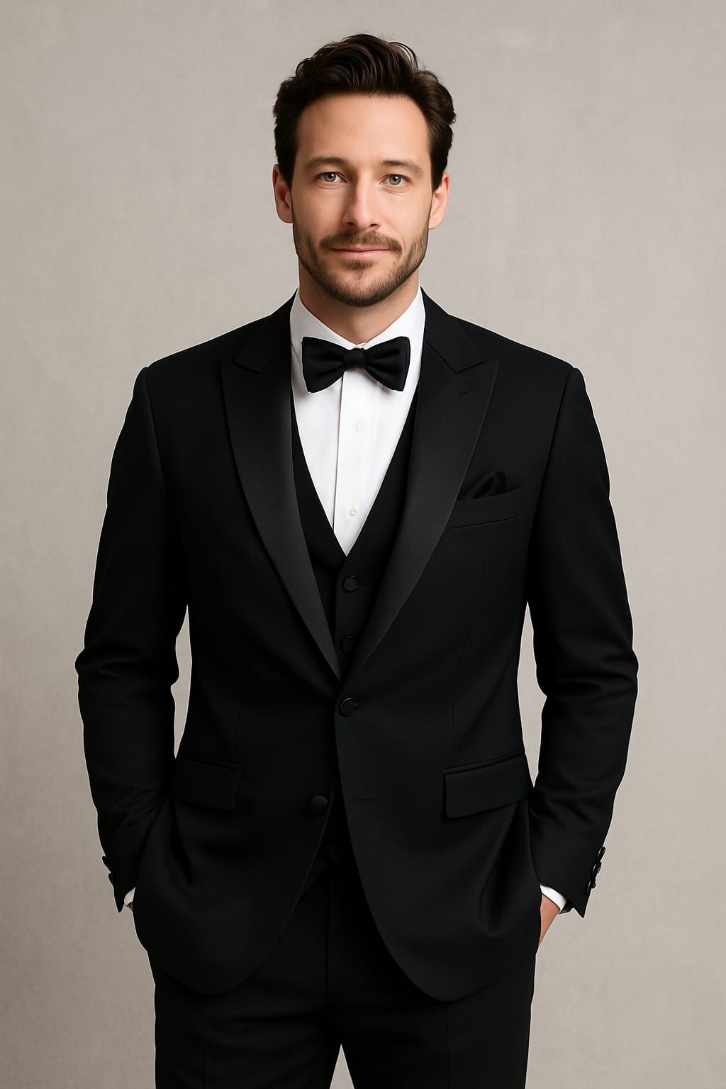 高品質!新郎衣装 ブラック タキシード ジャケット、パンツ、ベスト、蝶ネクタイ、チーフの5点セット