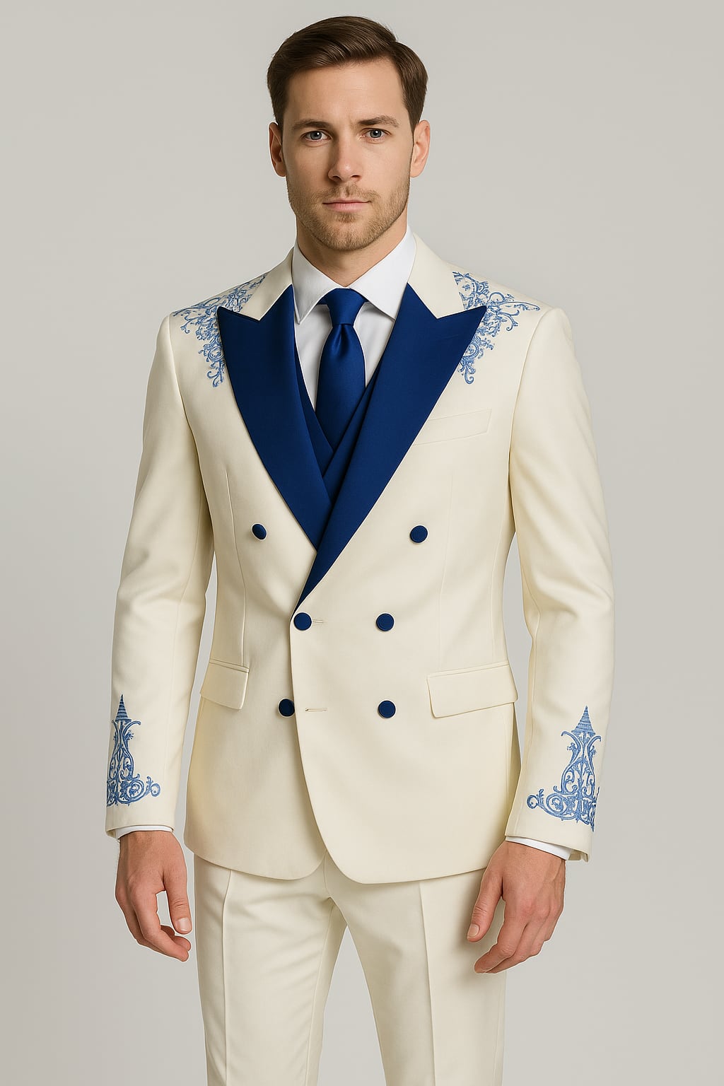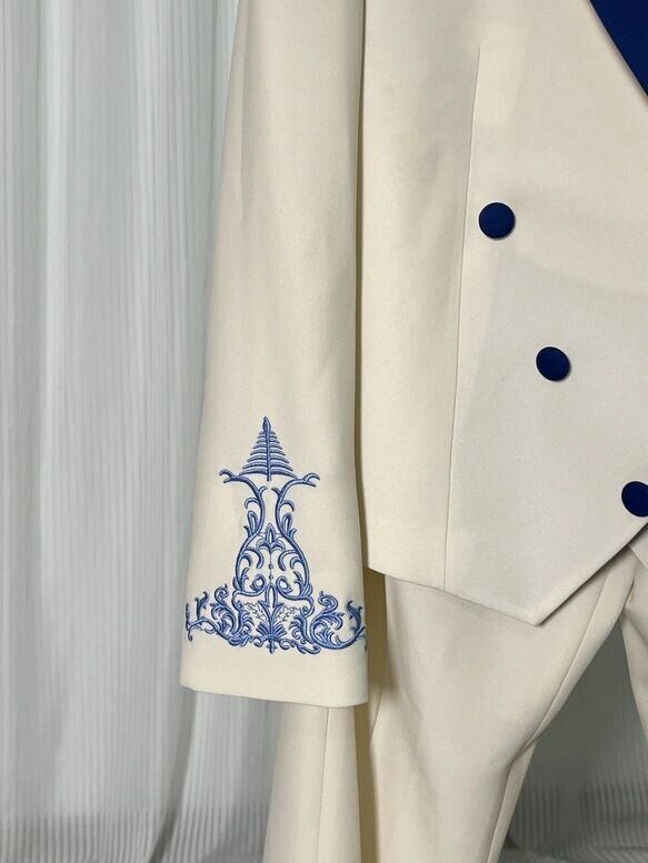 高品質!新郎衣装ベージュタキシード ジャケット、パンツ2点セット 3D立体刺繍(青)