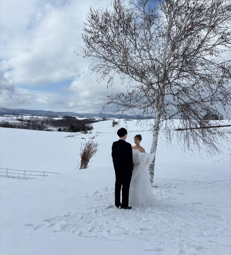 実例写真!ウェディングドレス ベアトップ 姫袖 リボン 柔らかく重ねたチュールスカート 可愛い 前撮り