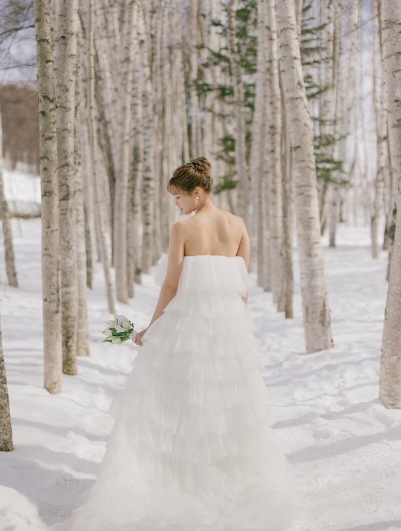実例写真!ウェディングドレス ベアトップ 柔らかく重ねたチュールスカート 可愛い オフホワイト 前撮り