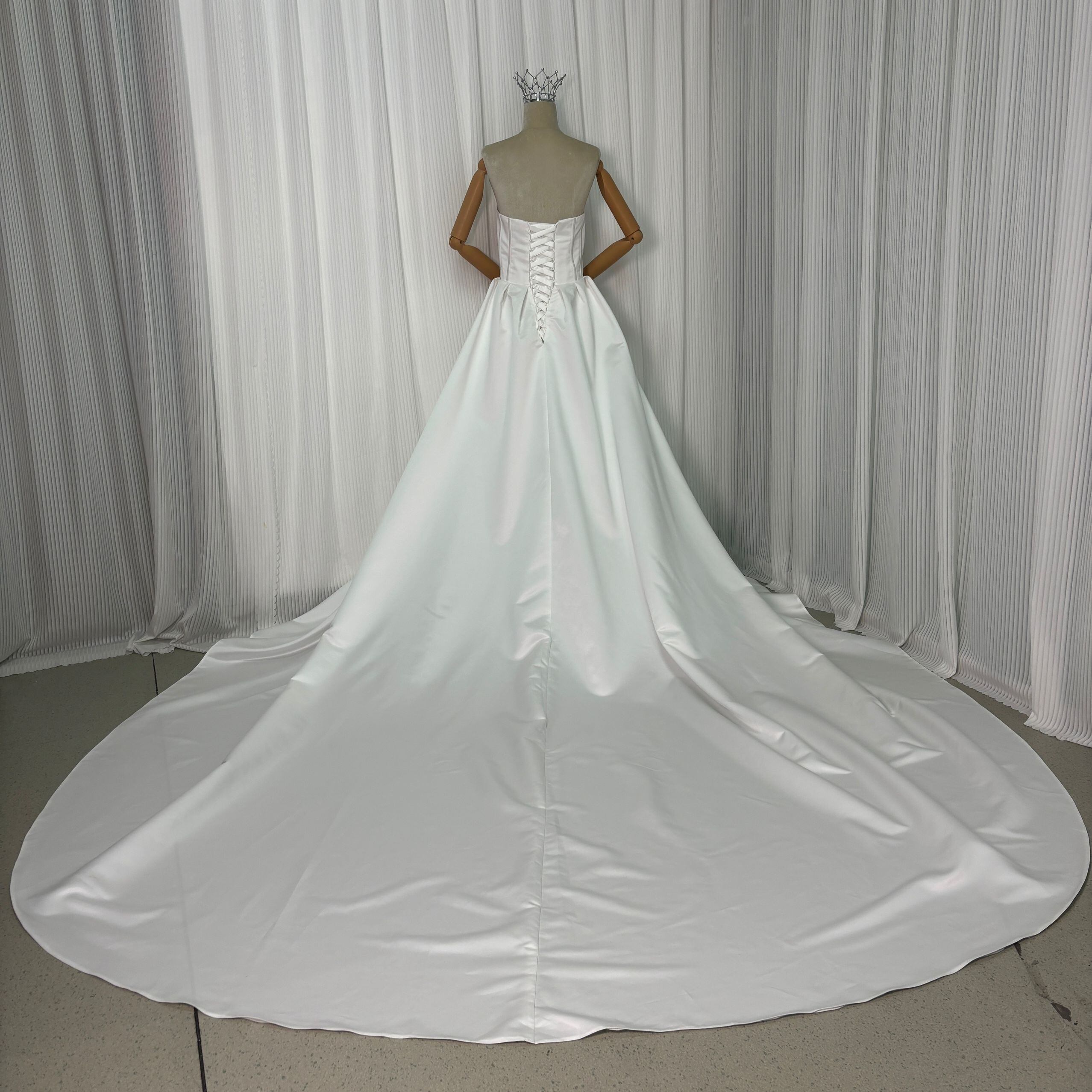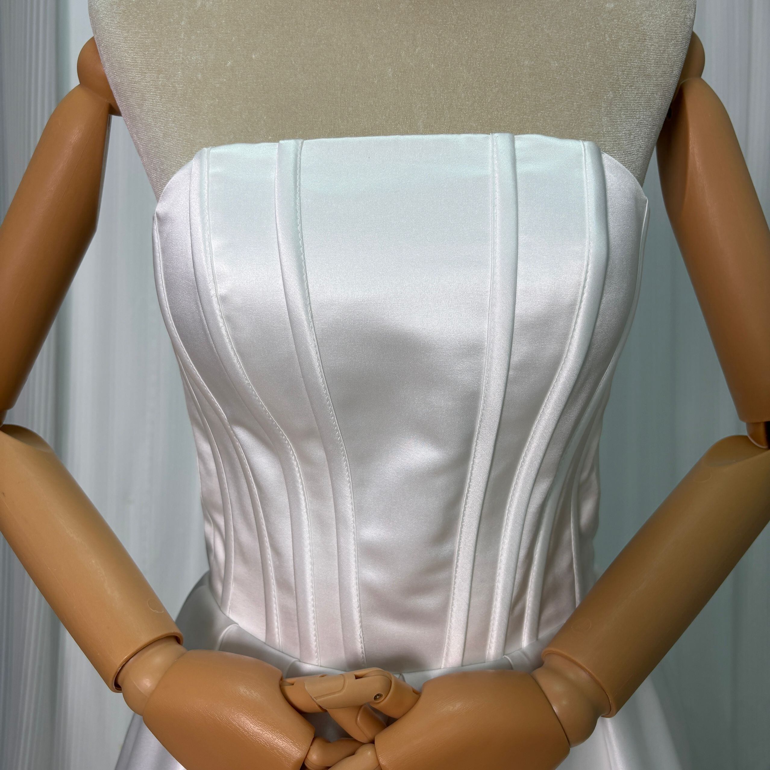 ウエディングドレス ベアトップ 光沢サテン ビスチェタイプ 結婚式 ロングトレーン 色直し