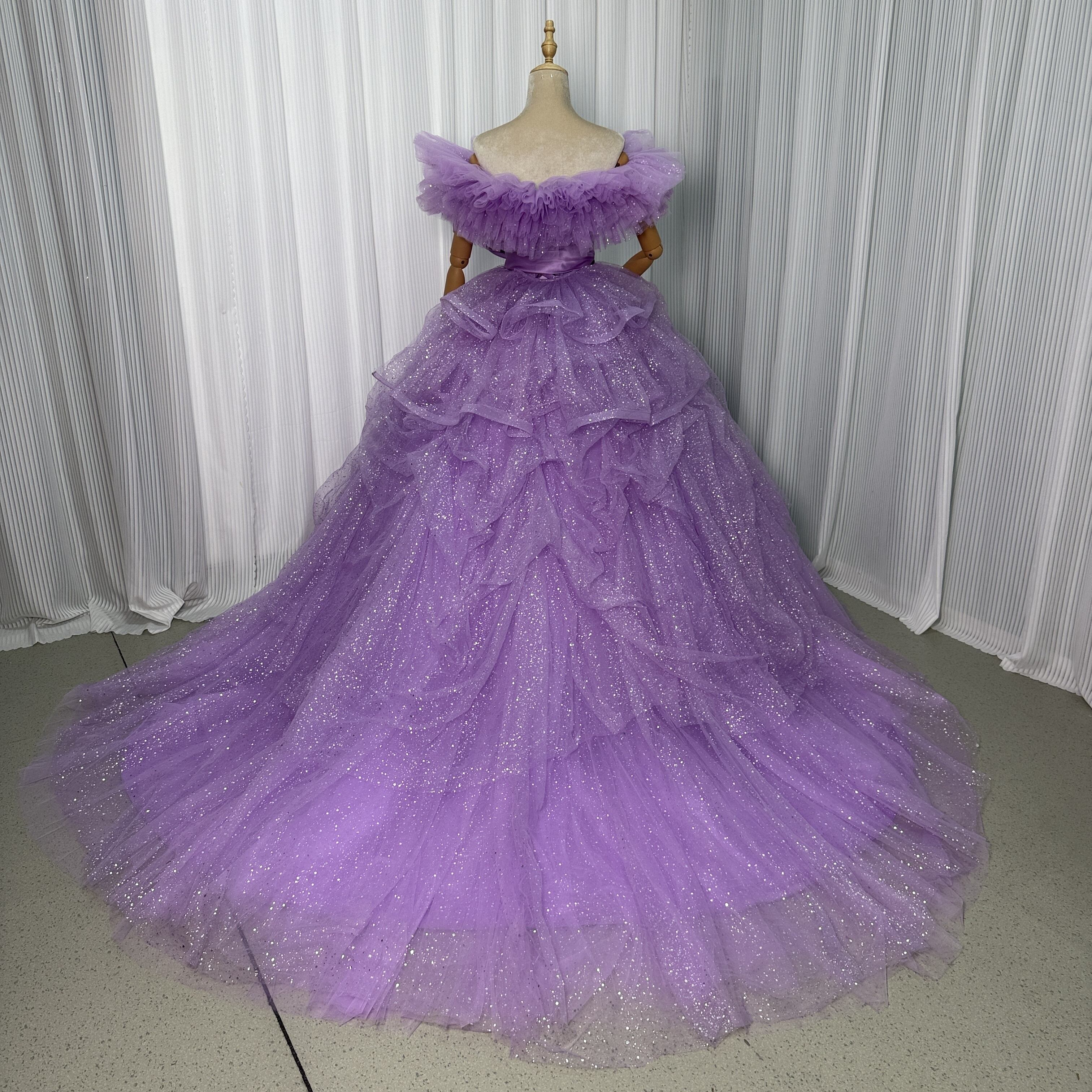 カラードレス パープル キラキラチュール オフショルダー サッシュベルト ラッフルフリル 優雅 披露宴
