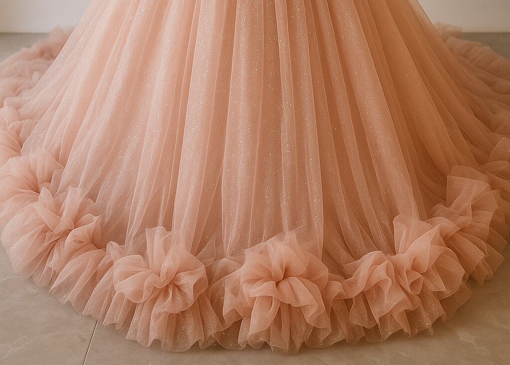 フリルカラードレス ベージュピンク キラキラ ふんわりオフショルダー グリッターチュール 結婚式 前撮り 二次会 披露宴