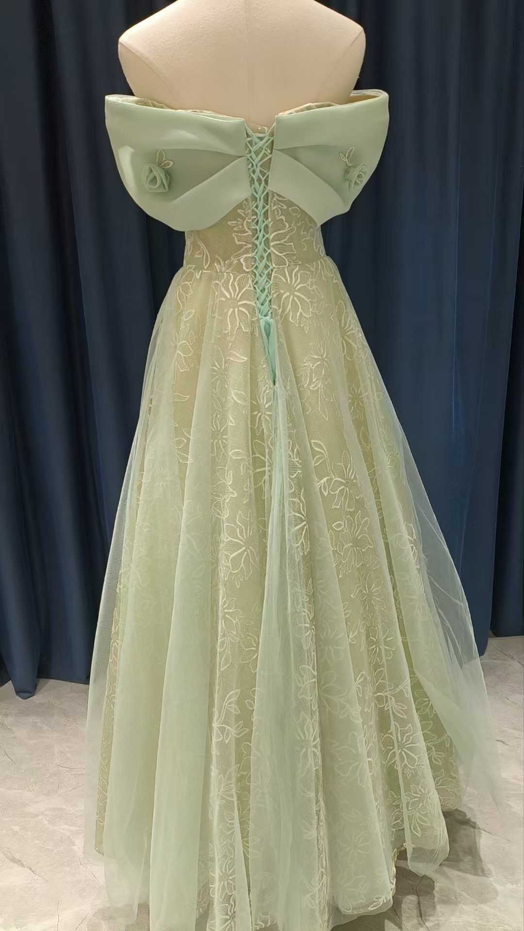 エレガント カラードレス ピスタチオグリーン オフショルダー ロング 贅沢な小花総レース パーティーワンピース