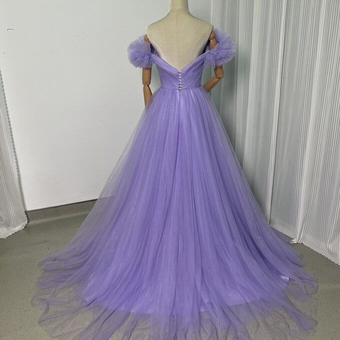 実例写真!カラードレス オーキッド オフショルダー チュールドレス くるみボタン フリル袖 ふわふわドレス 謝恩会