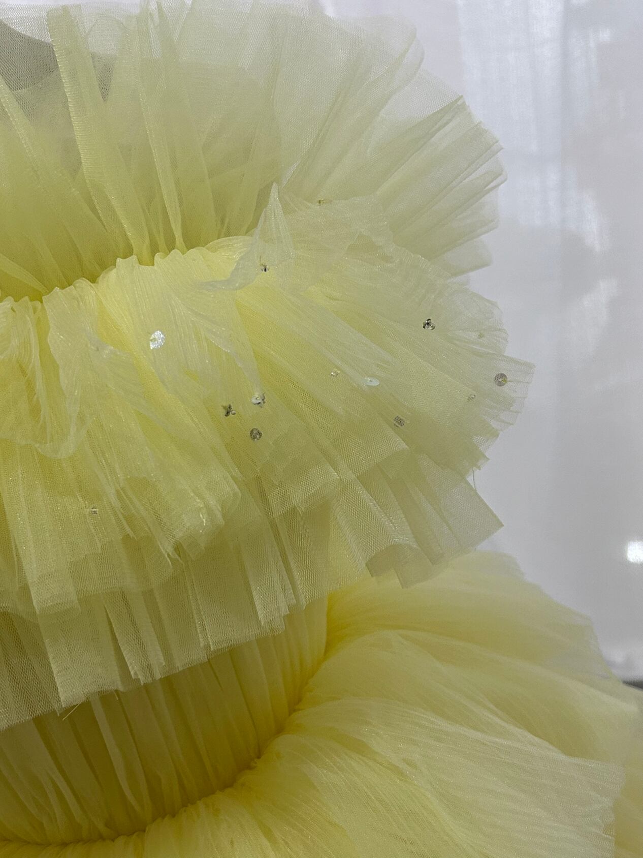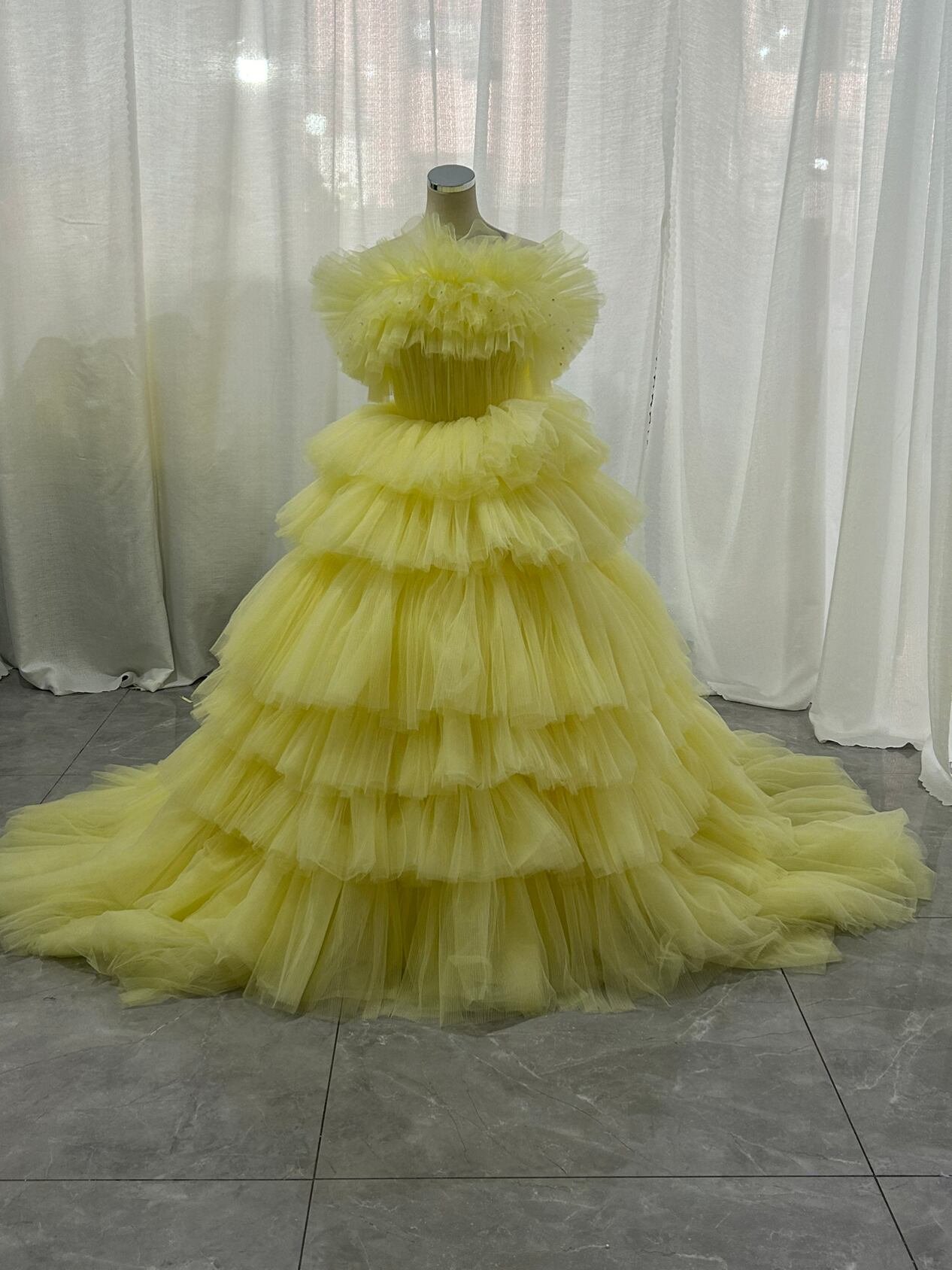 カラードレス イエロー ベアトップ ティアードのドレス 編み上げ チュールスカート 花嫁