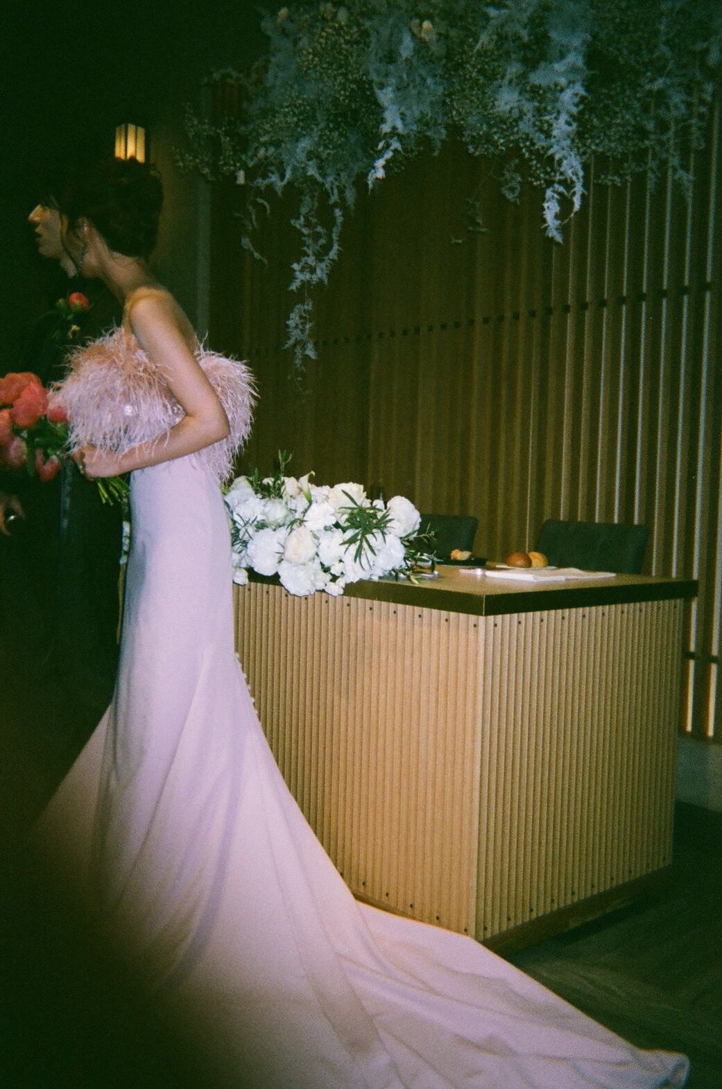 実例写真!オーストリッチ カラードレス ピンク クレープ生地 ベアトップ くるみボタン 披露宴/結婚式