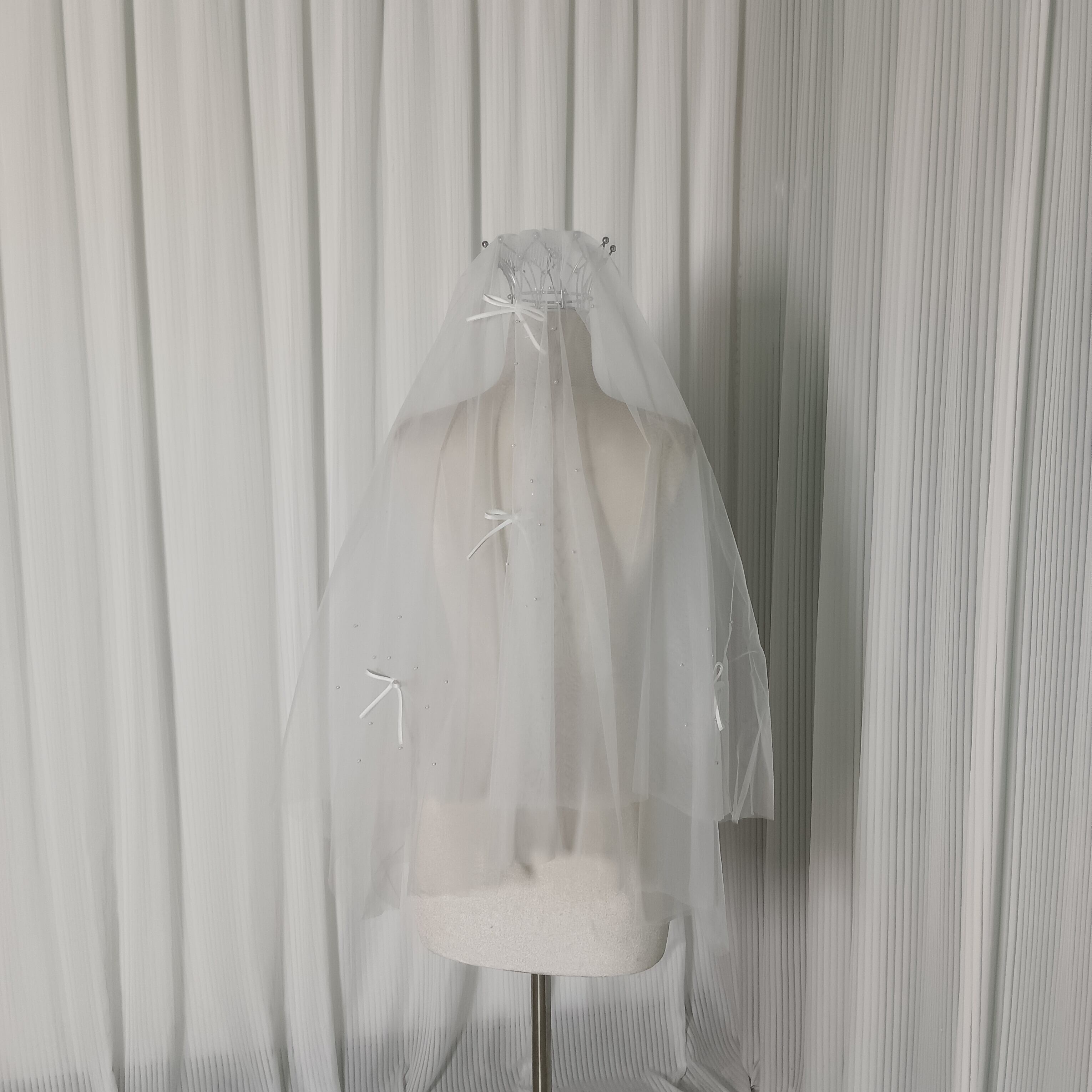 ショートベール パール リボン コーム付き オフホワイト 色直し 花嫁/ウェディングドレス