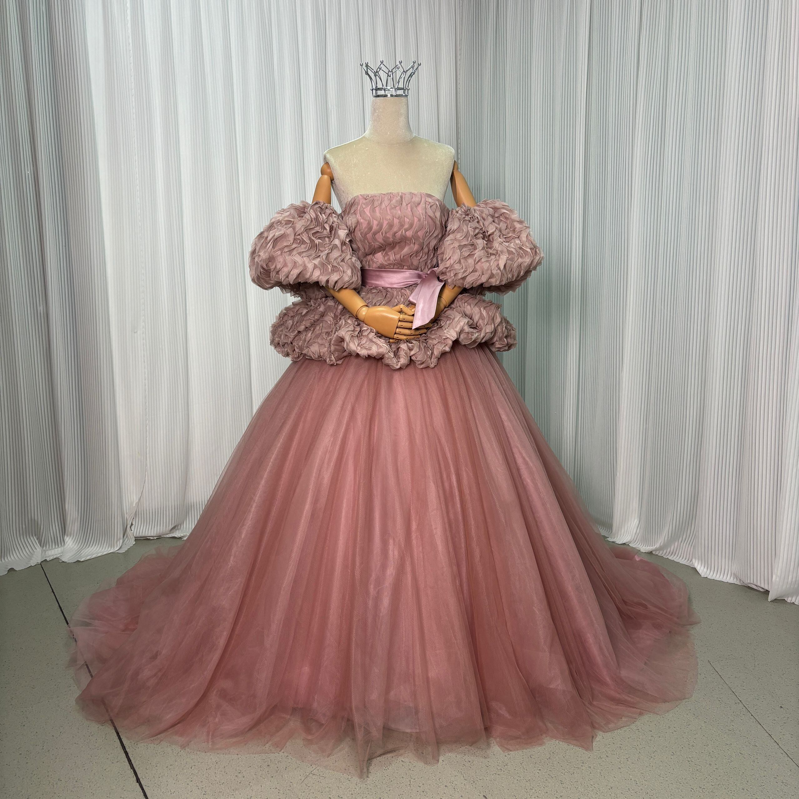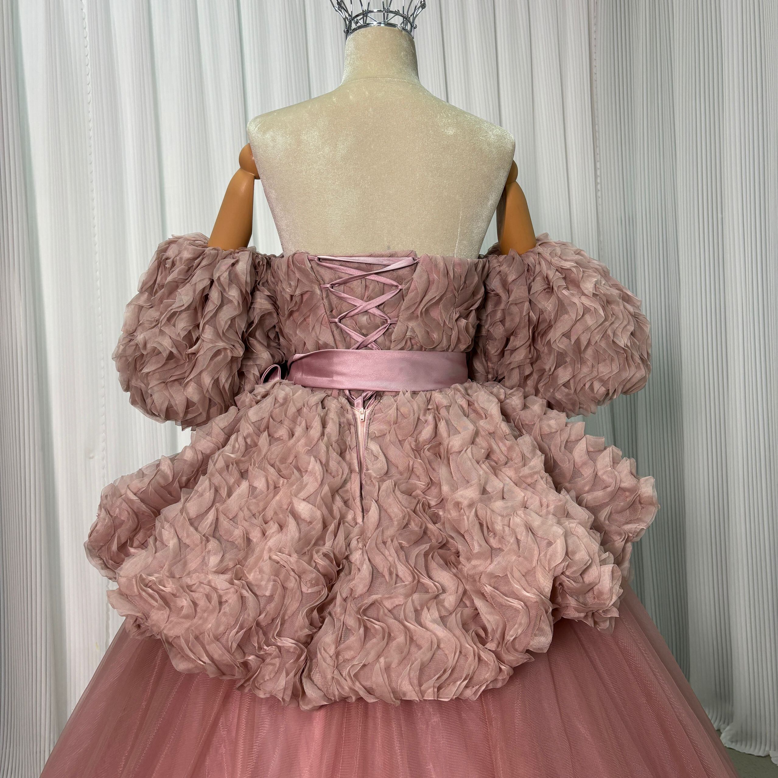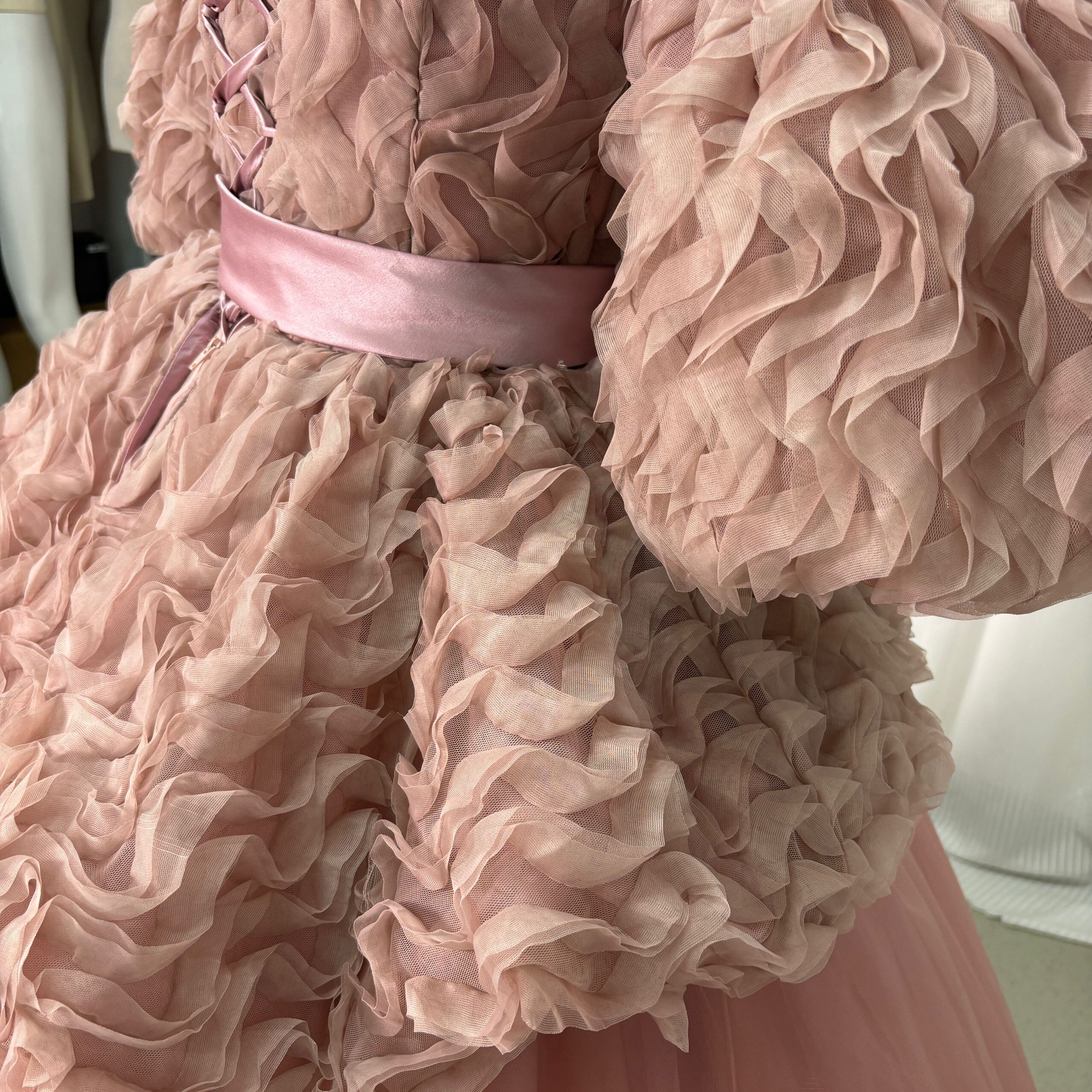 カラードレス ピンク 取り外し袖 編み上げ 可愛い プリンセスライン もこもこドレス ラッフルフリル 花嫁