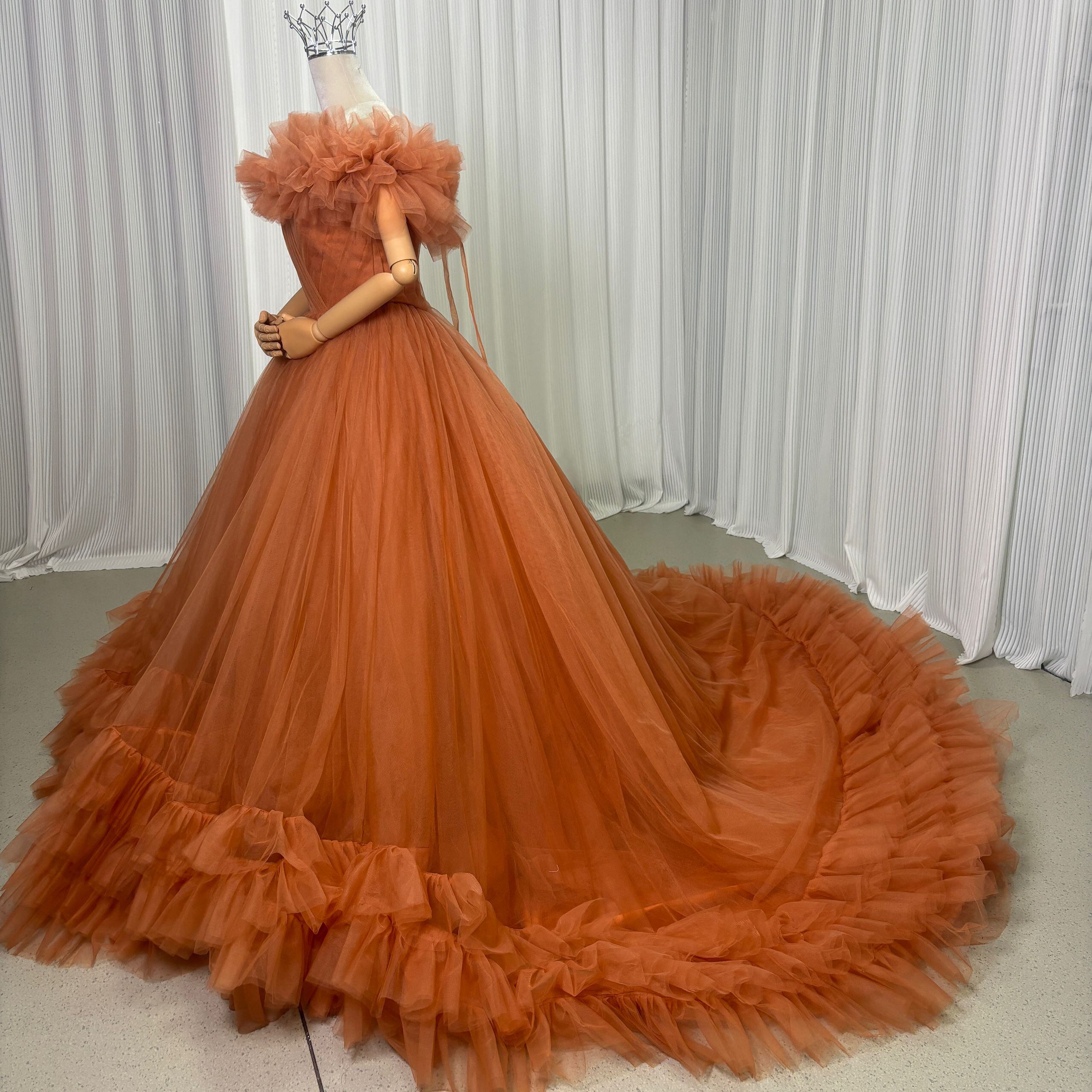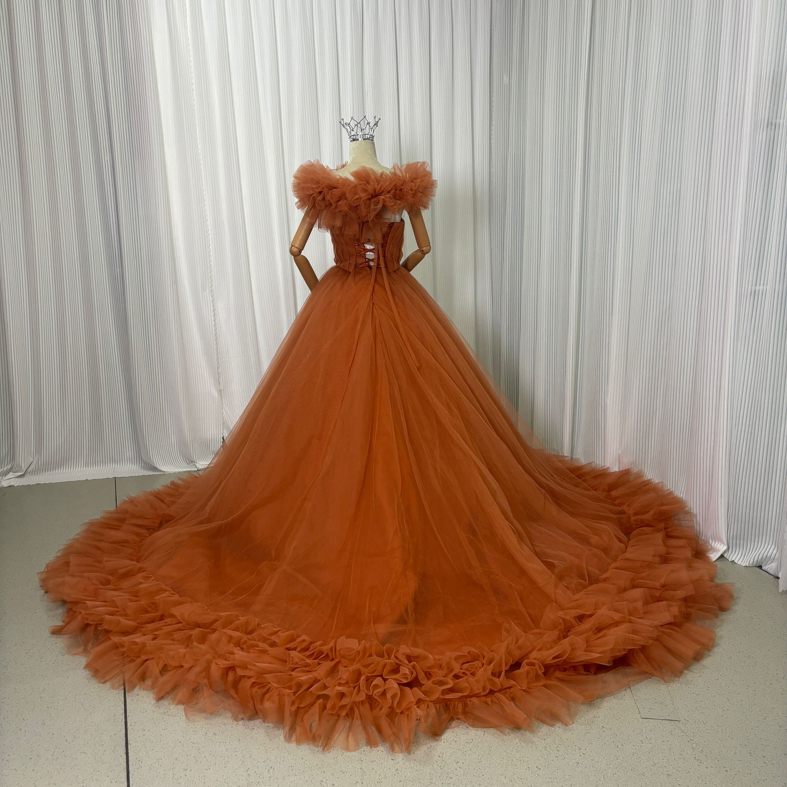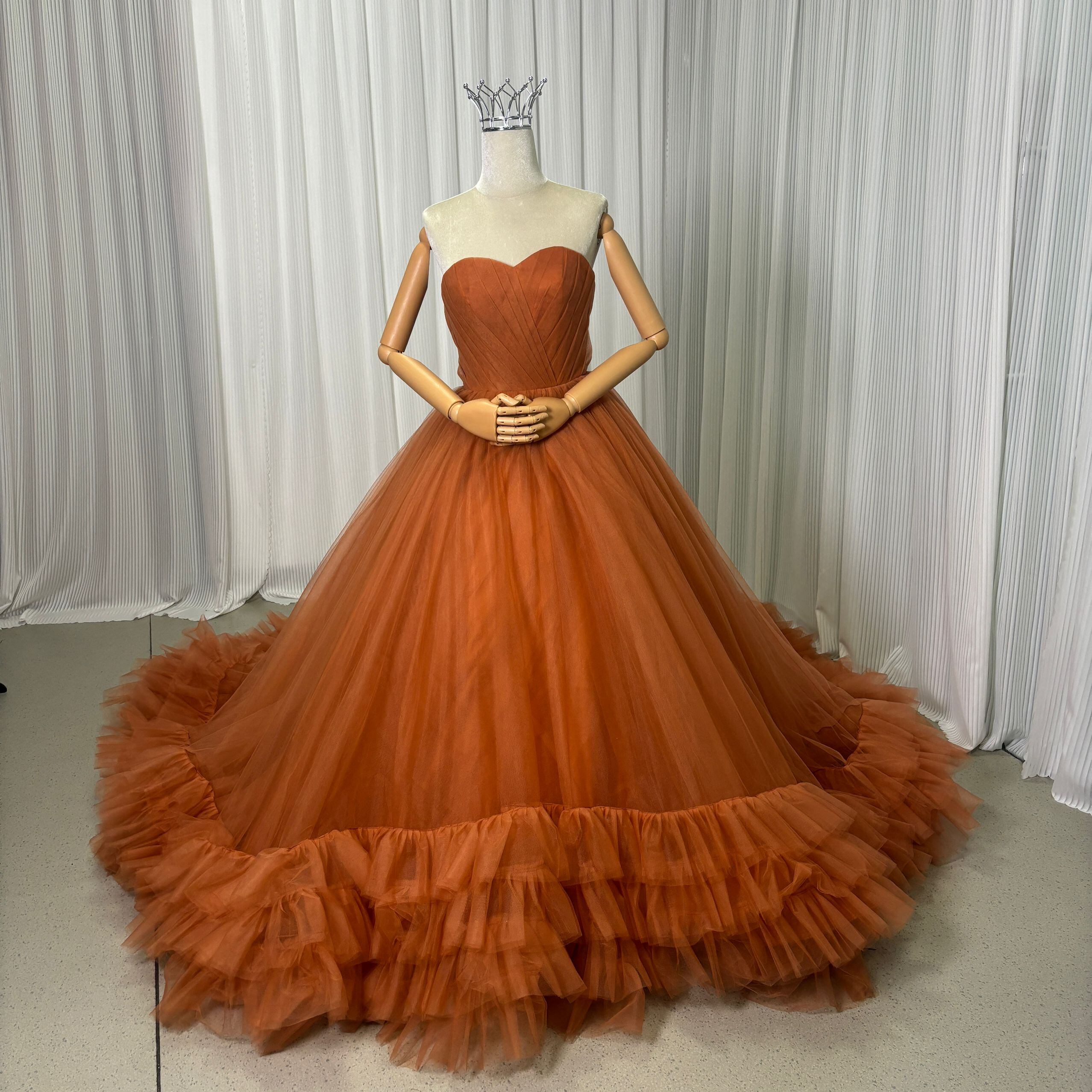 オレンジ カラードレス 取り外しオフショルダー ラッフルフリル 華やかなトレーン 前撮り