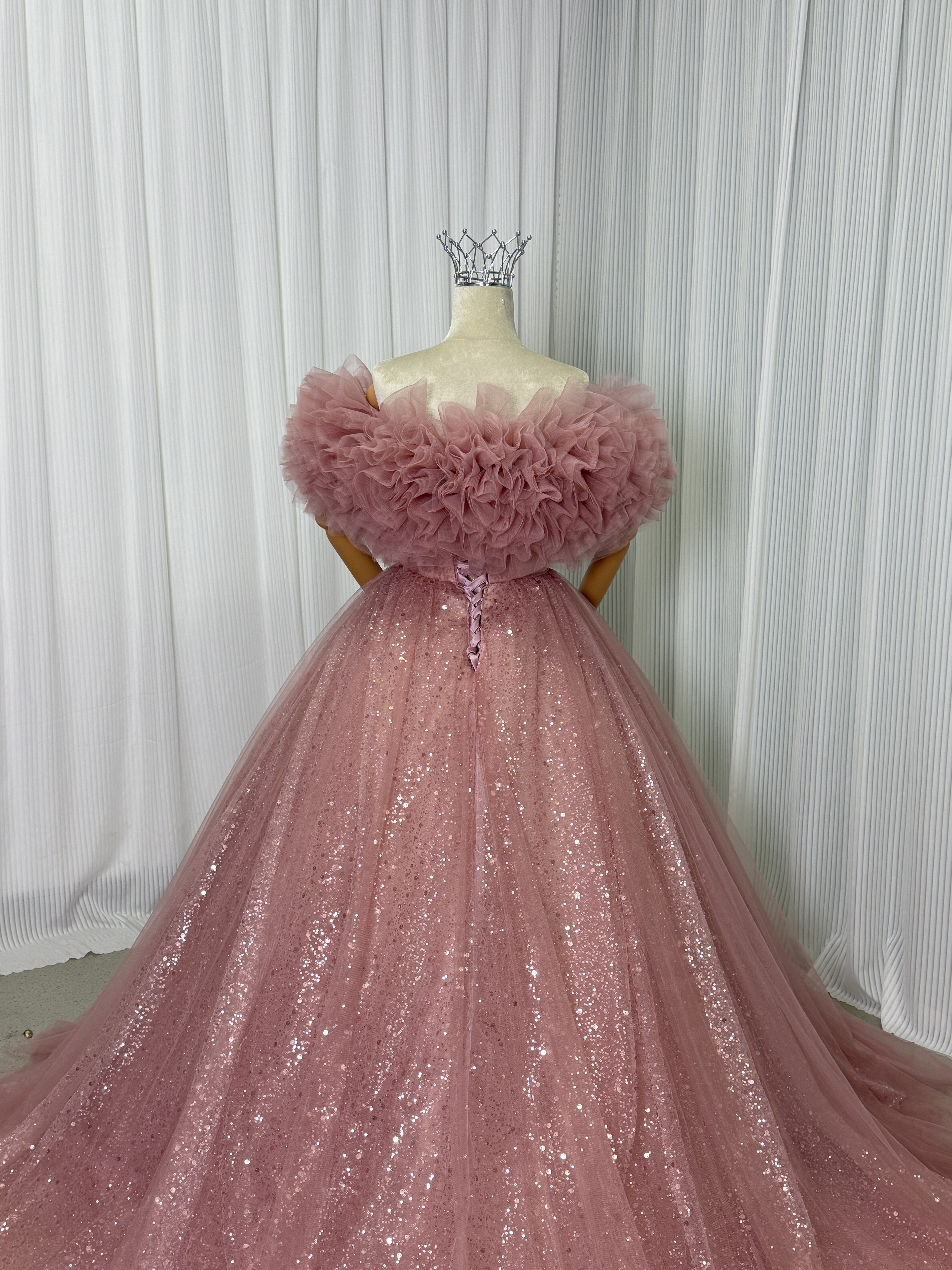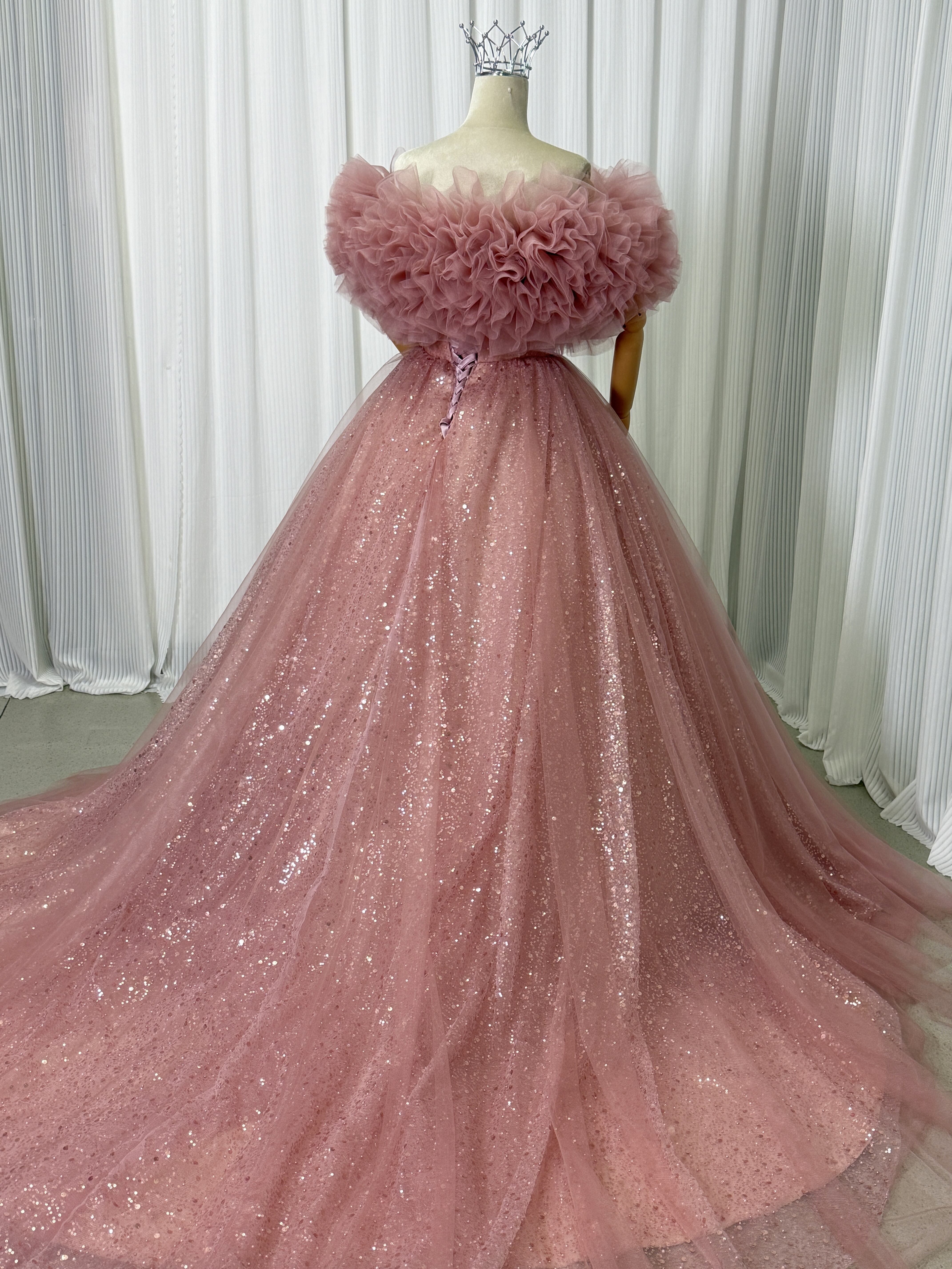 カラードレス ピンク 取り外しオフショルダー キラキラチュール 編み上げ 可愛い プリンセスライン 花嫁