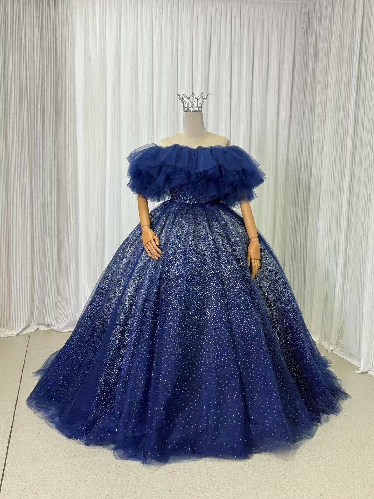 豪華!カラードレス ネイビー 取り外しオフショルダー 編み上げ キラキラグリッターチュール 前撮り