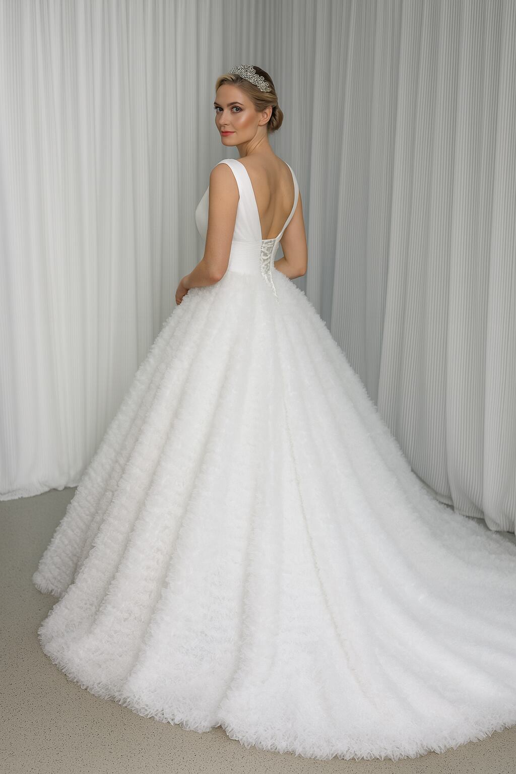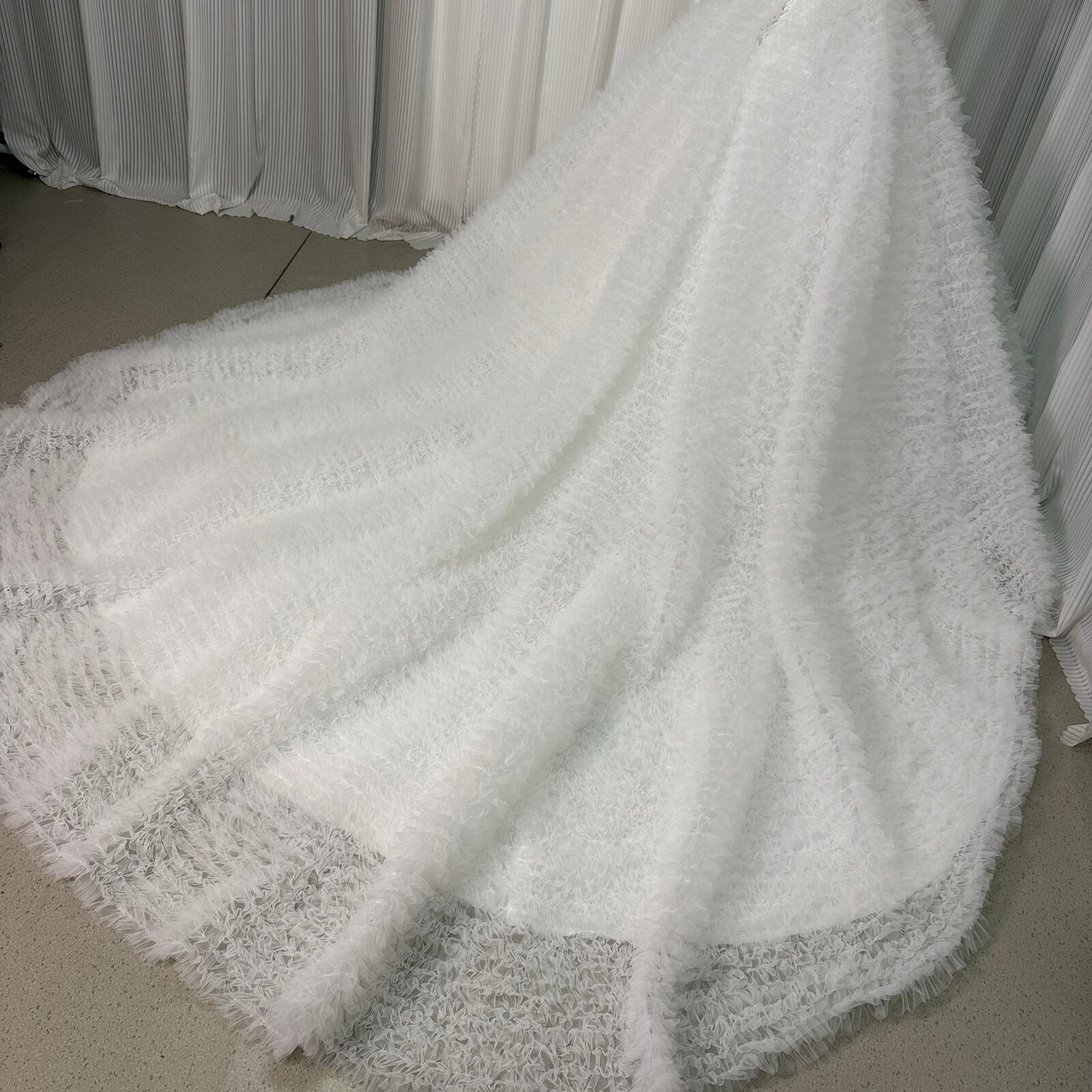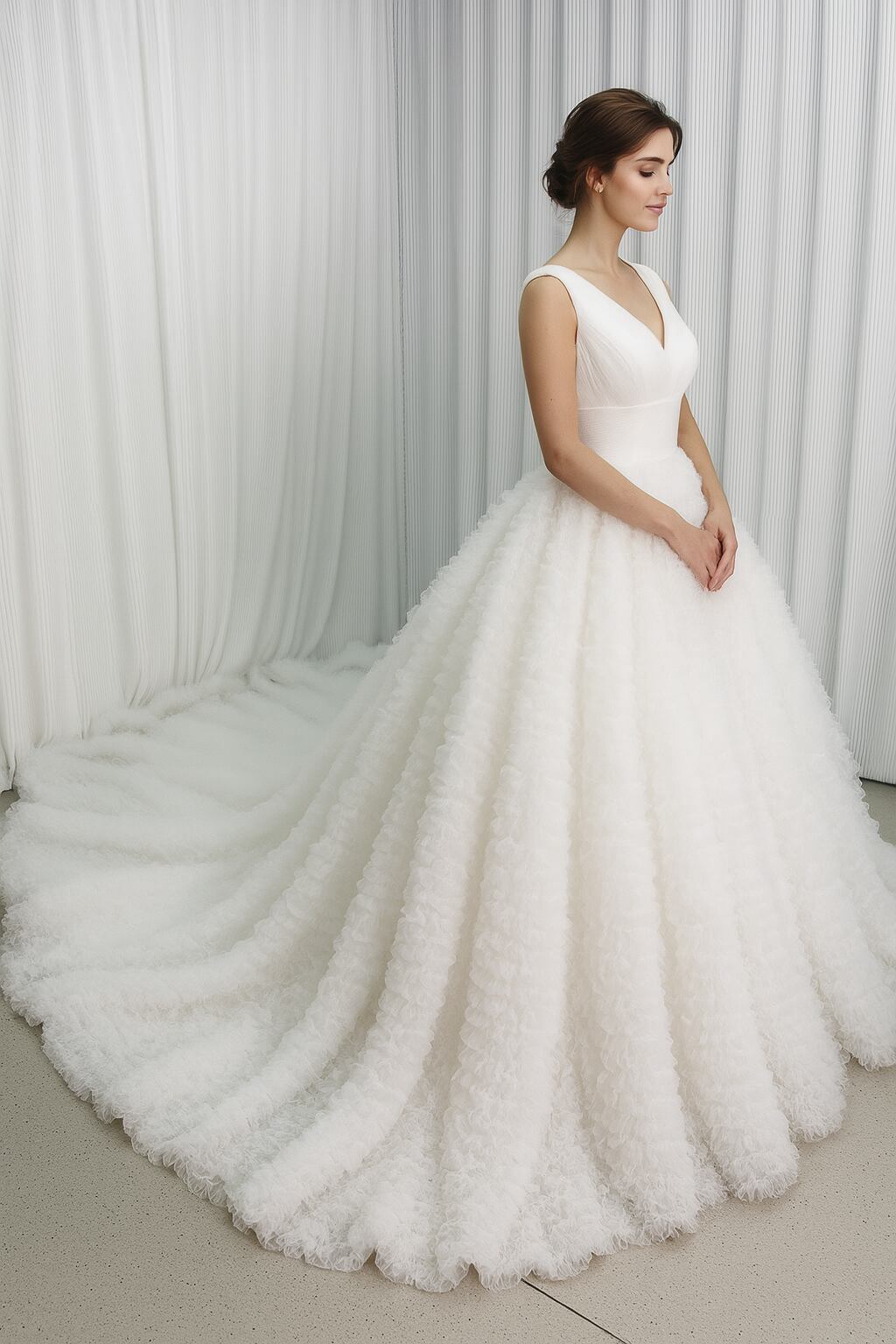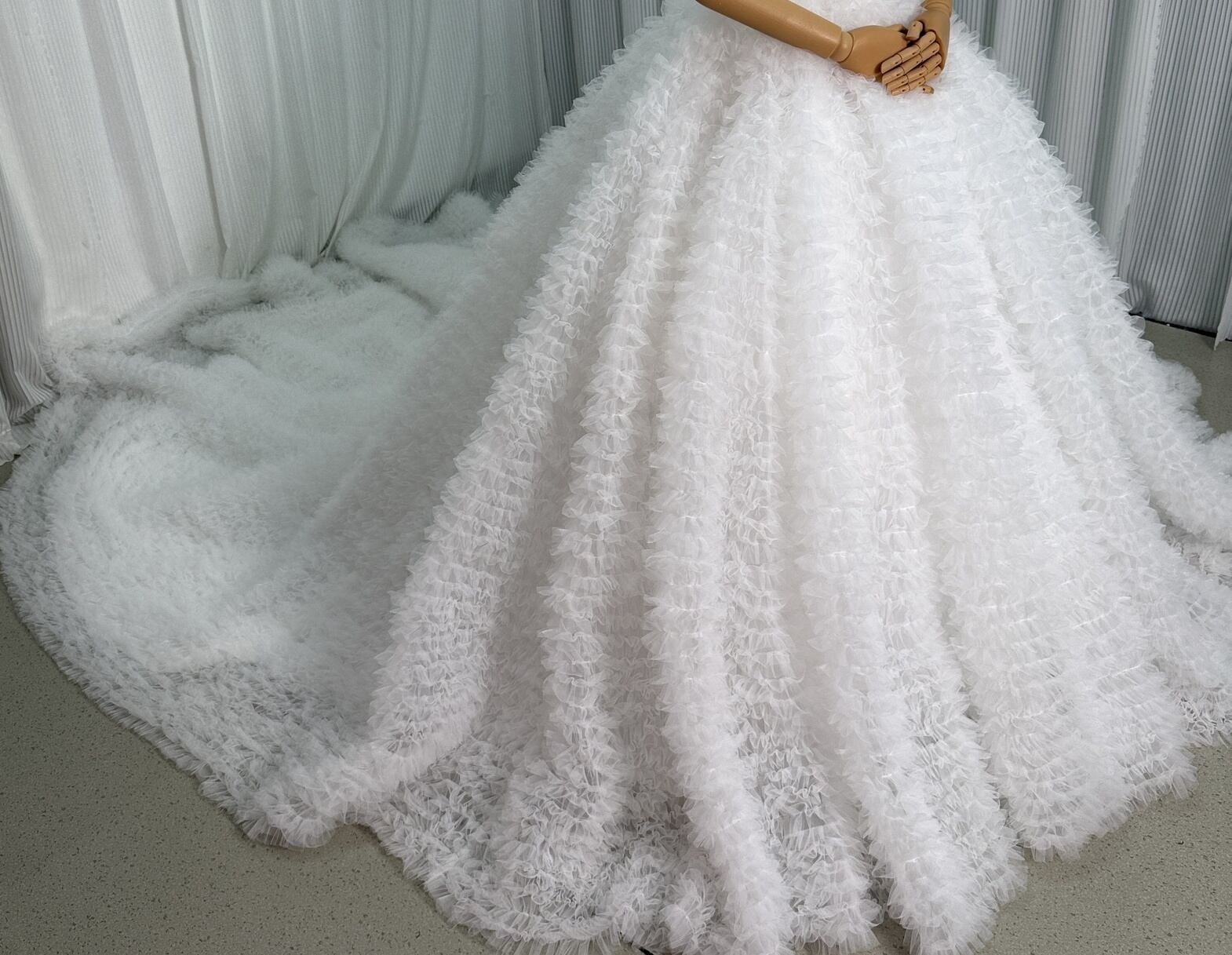 韓国風もこもこウエディングドレス Vネック ボリュームチュール レースアップ トレーン 結婚式