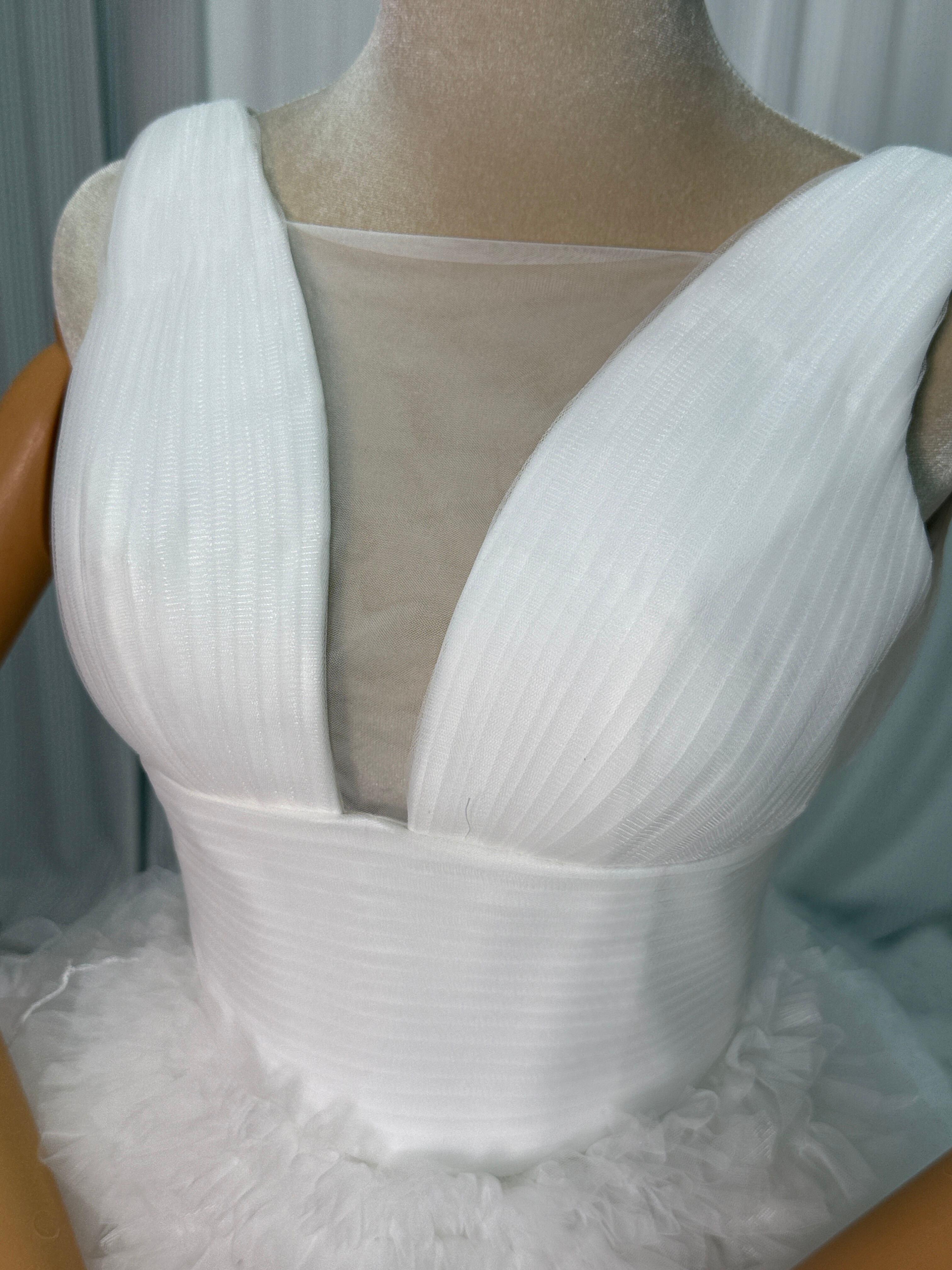 韓国風もこもこウエディングドレス ボリュームチュール Vネック レースアップ トレーン 結婚式