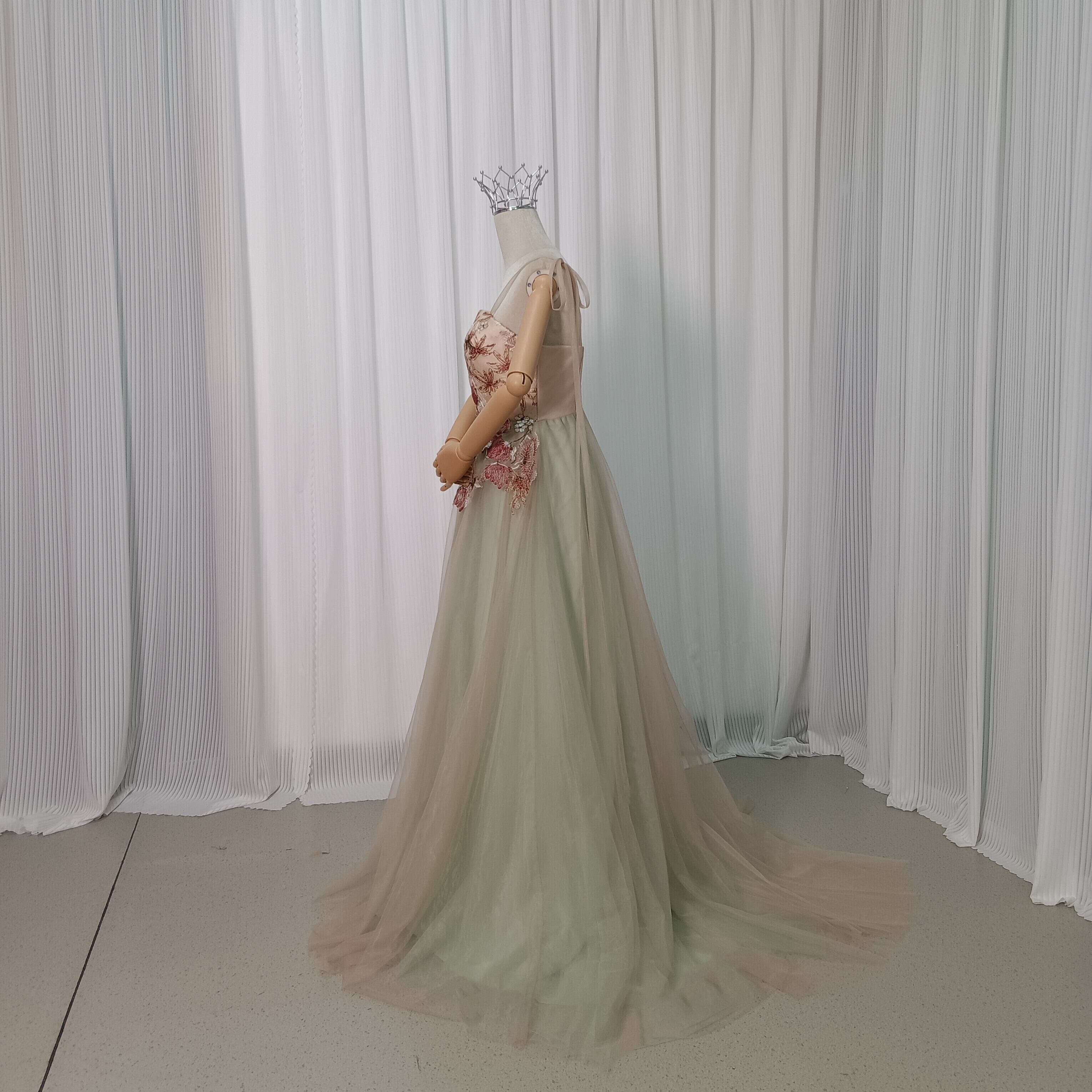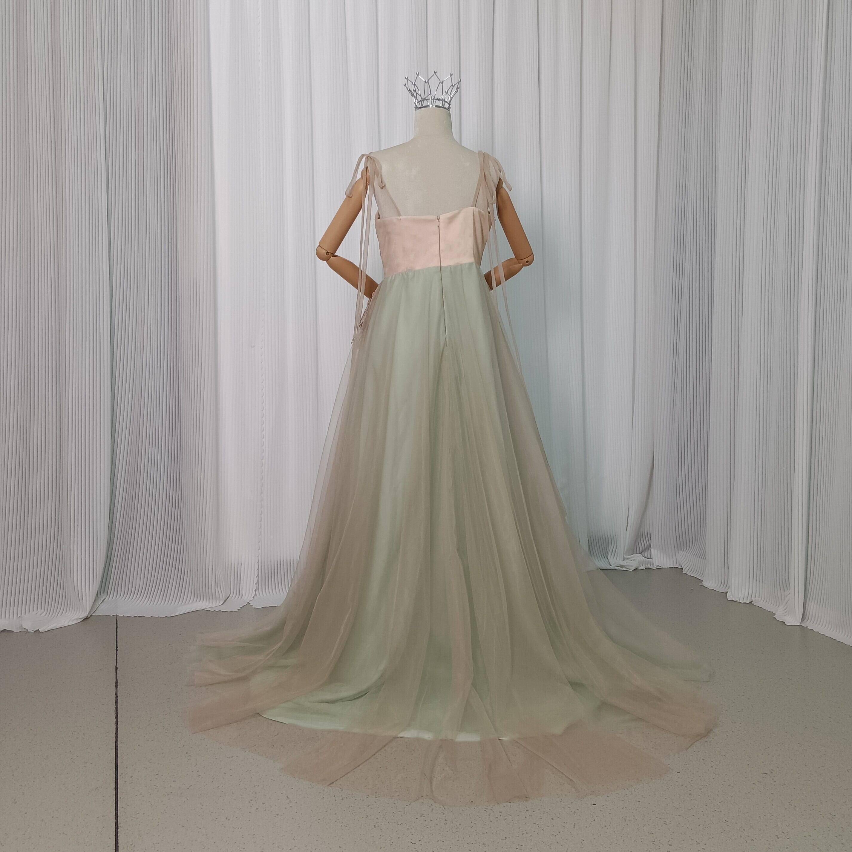 カラードレス ライトグリーン ベージュ キャミソール リーフ刺繍 2次会 ファスナー