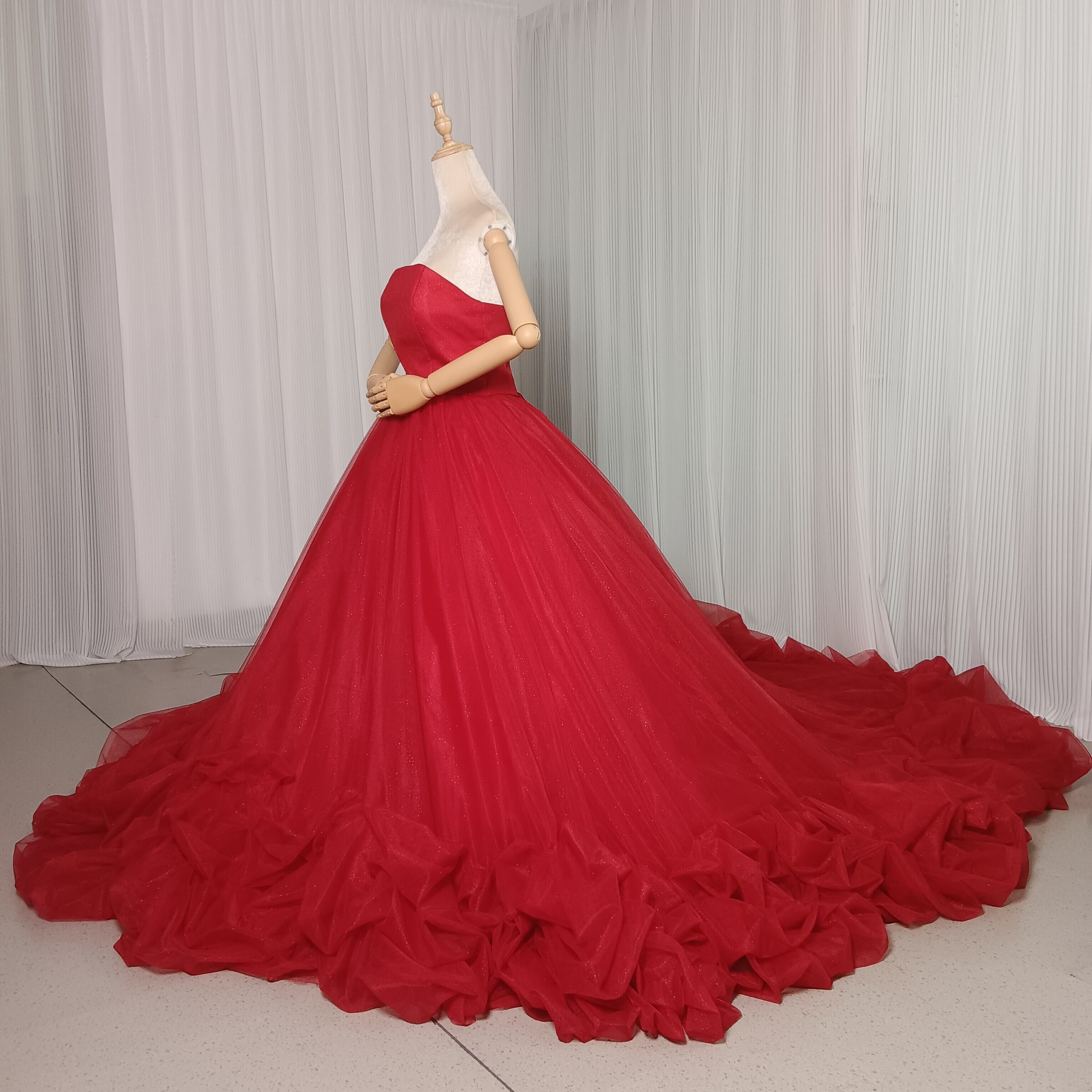 豪華!カラードレス ボルドー色 キラキラグリッターチュール ビスチェタイプ 華やかなトレーン 結婚式