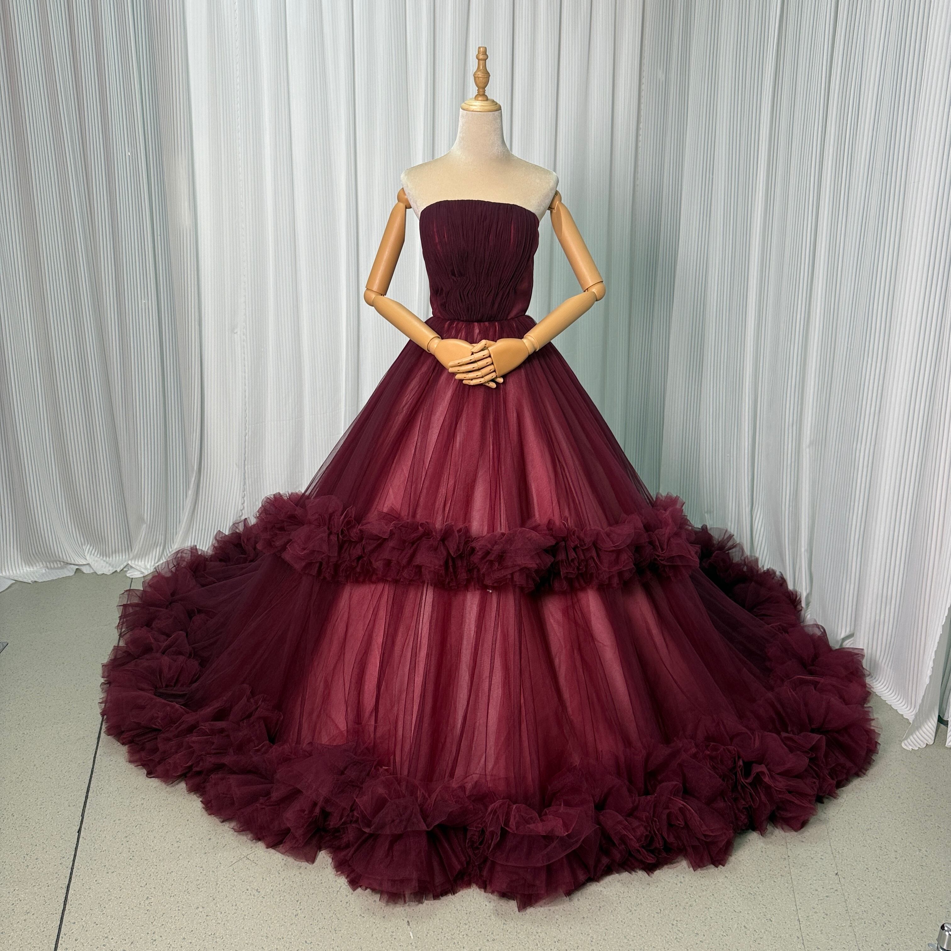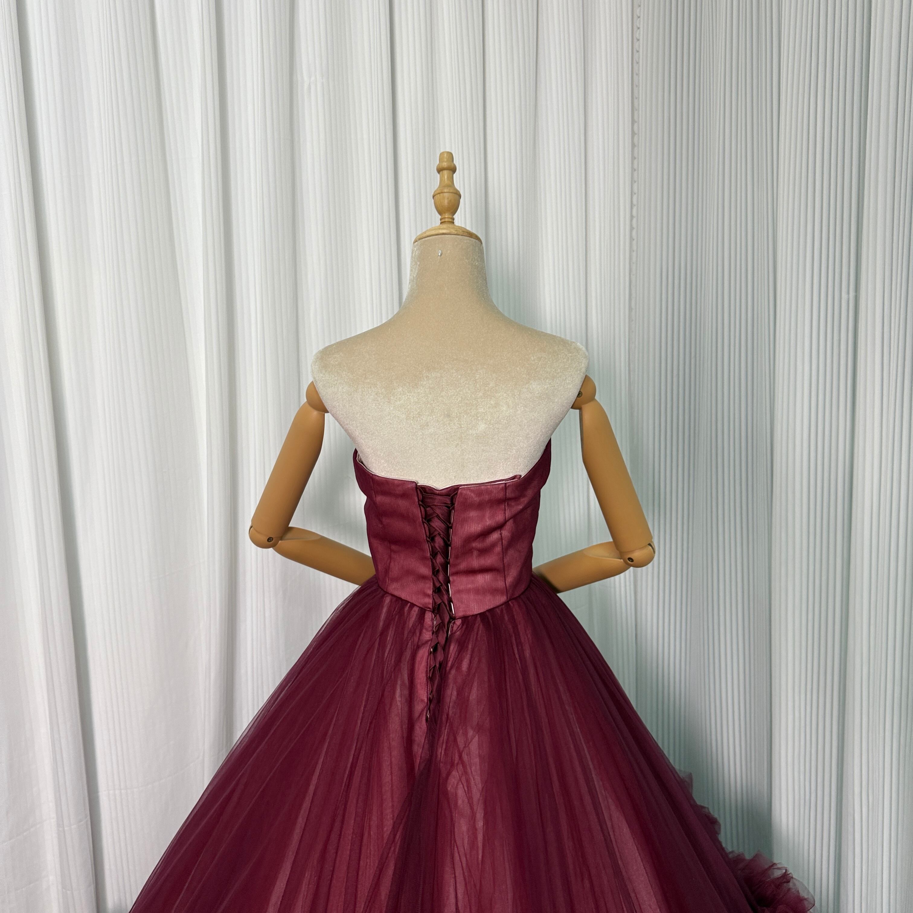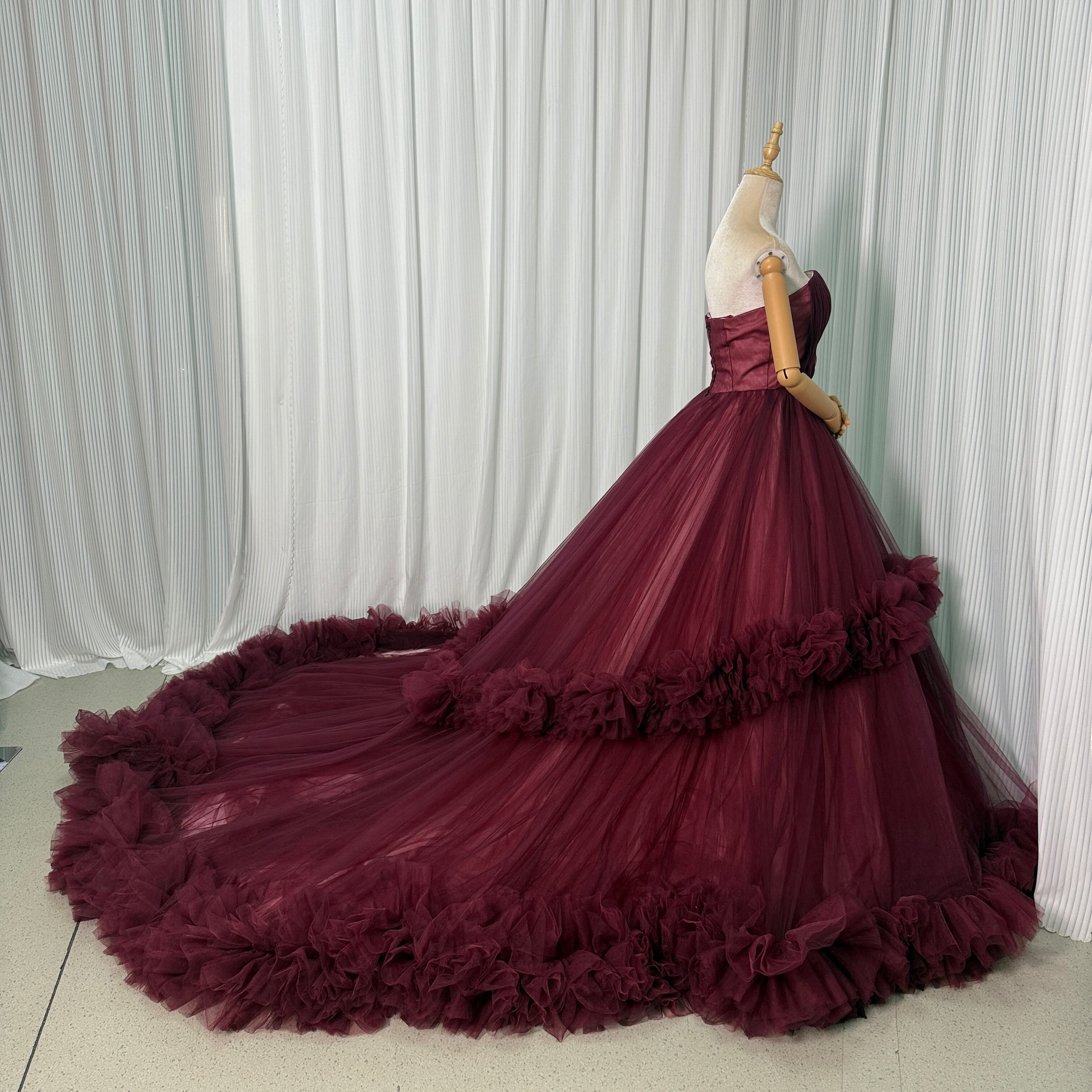 人気上昇!カラードレス ボルドー色 ベアトップ ラッフルフリル 華やかなトレーン 前撮り