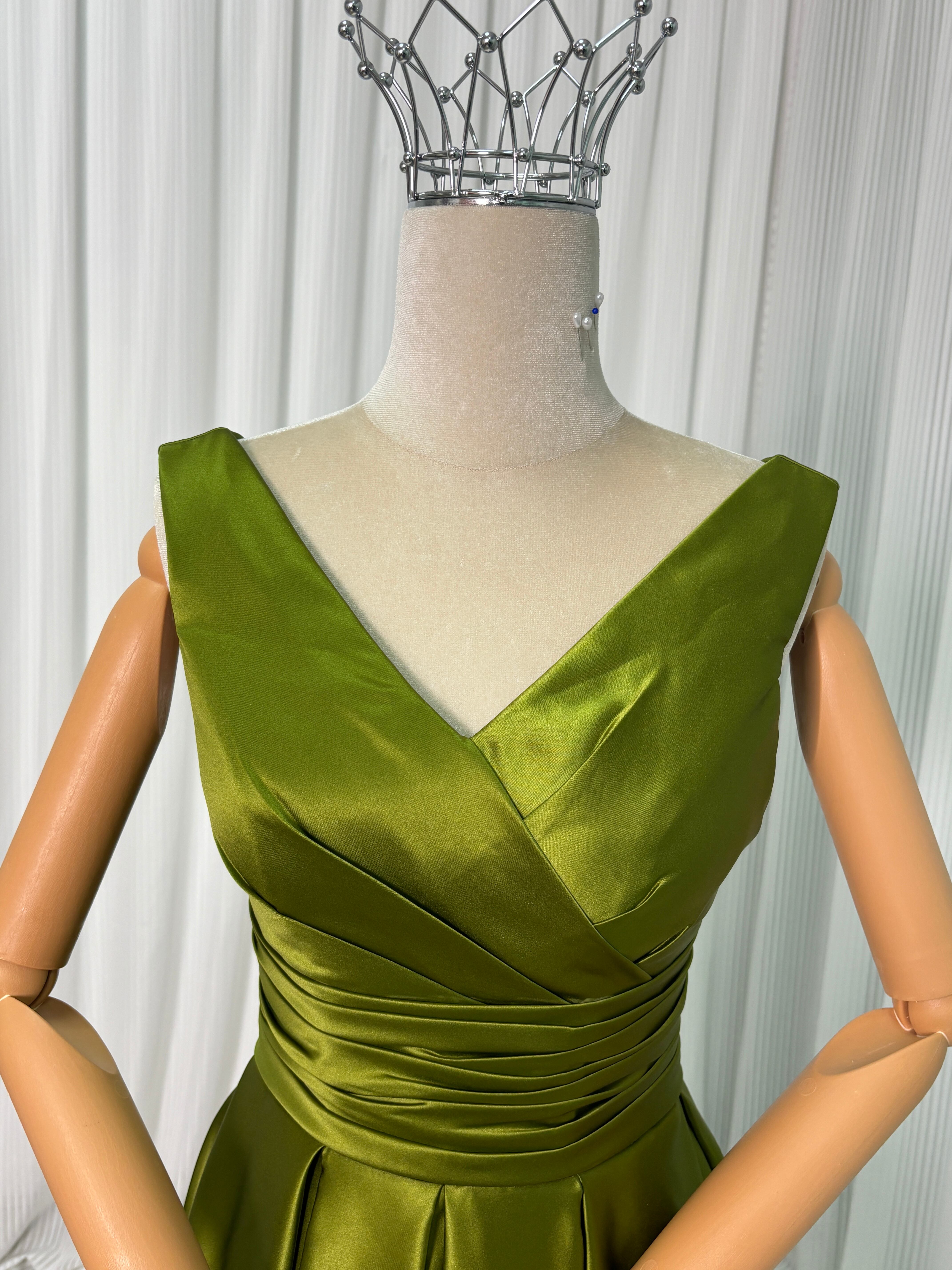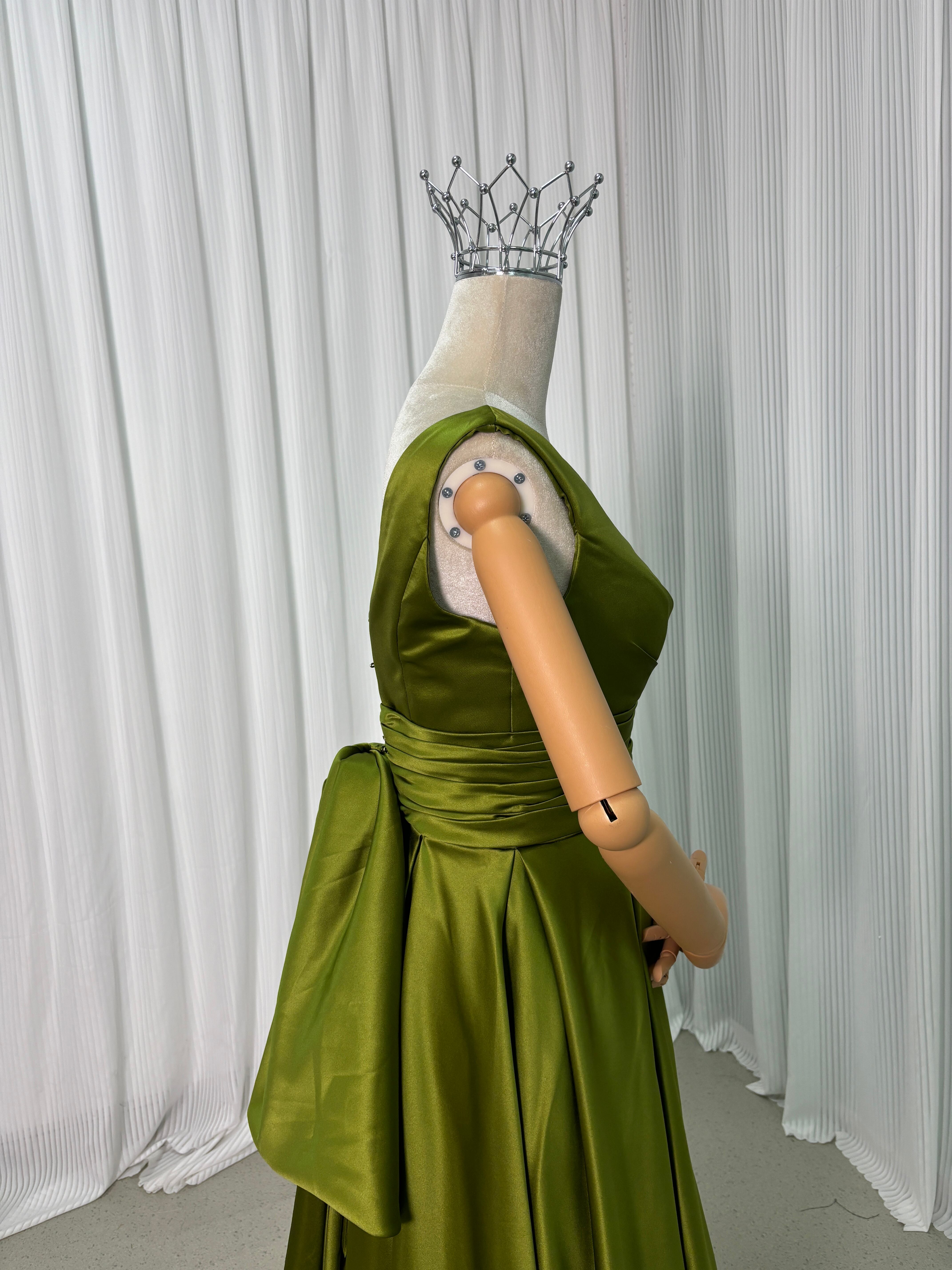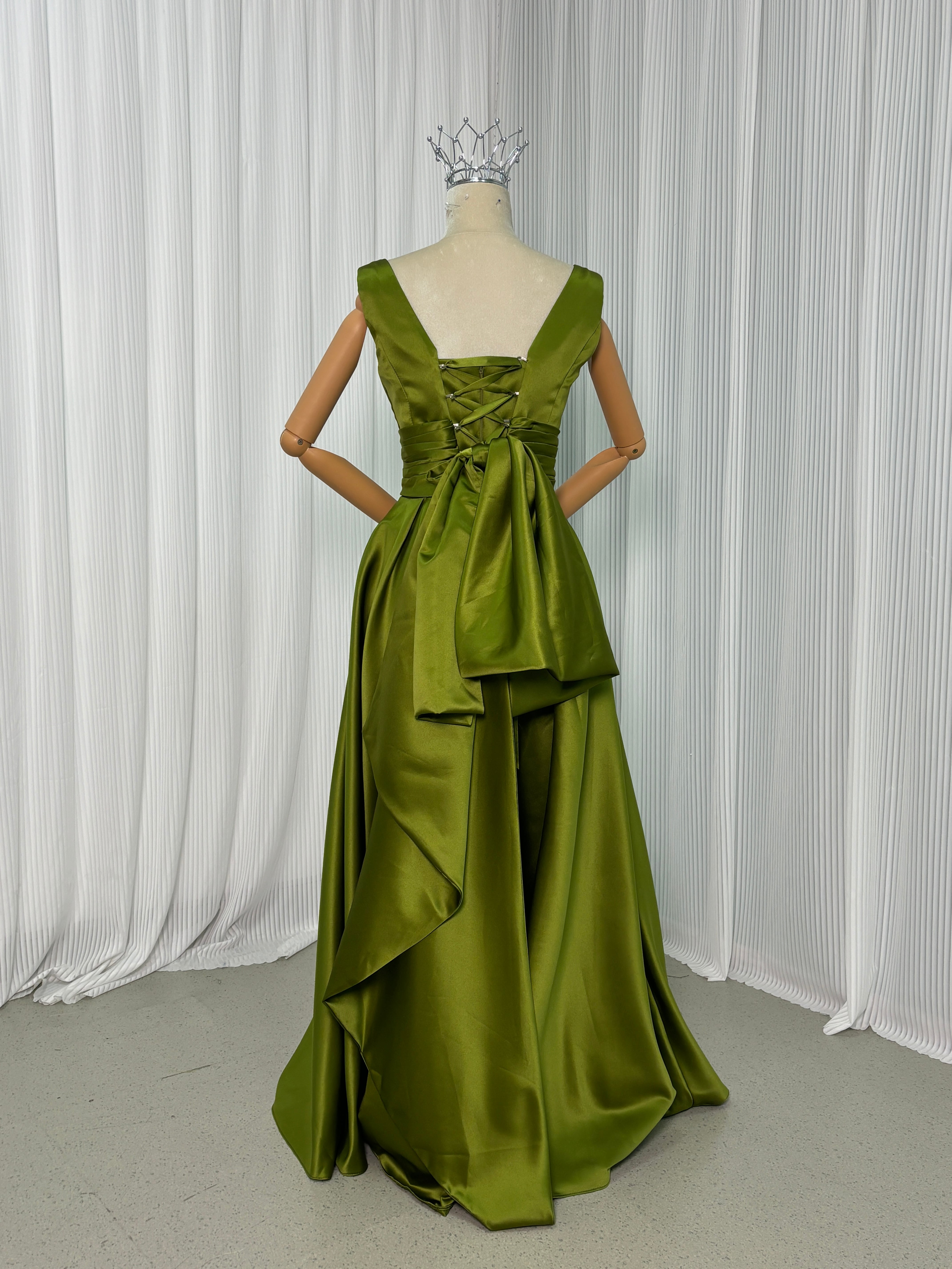 カラードレス グリーン Vネック 光沢サテン バックリボン 編み上げ ロング 演奏会/音楽会