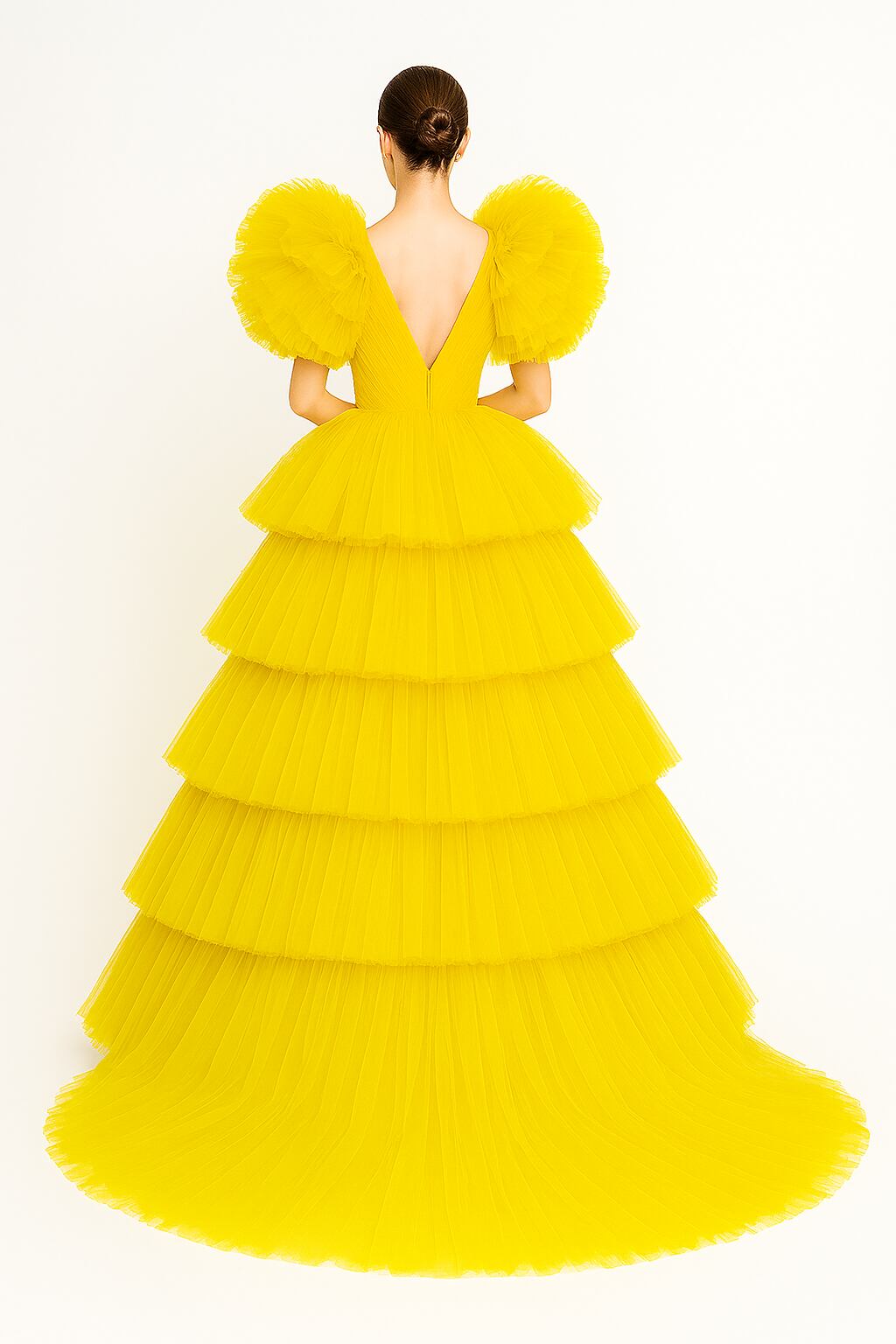 イエローボリューミーなドレス カラードレス ティアード もこもこ Vネック