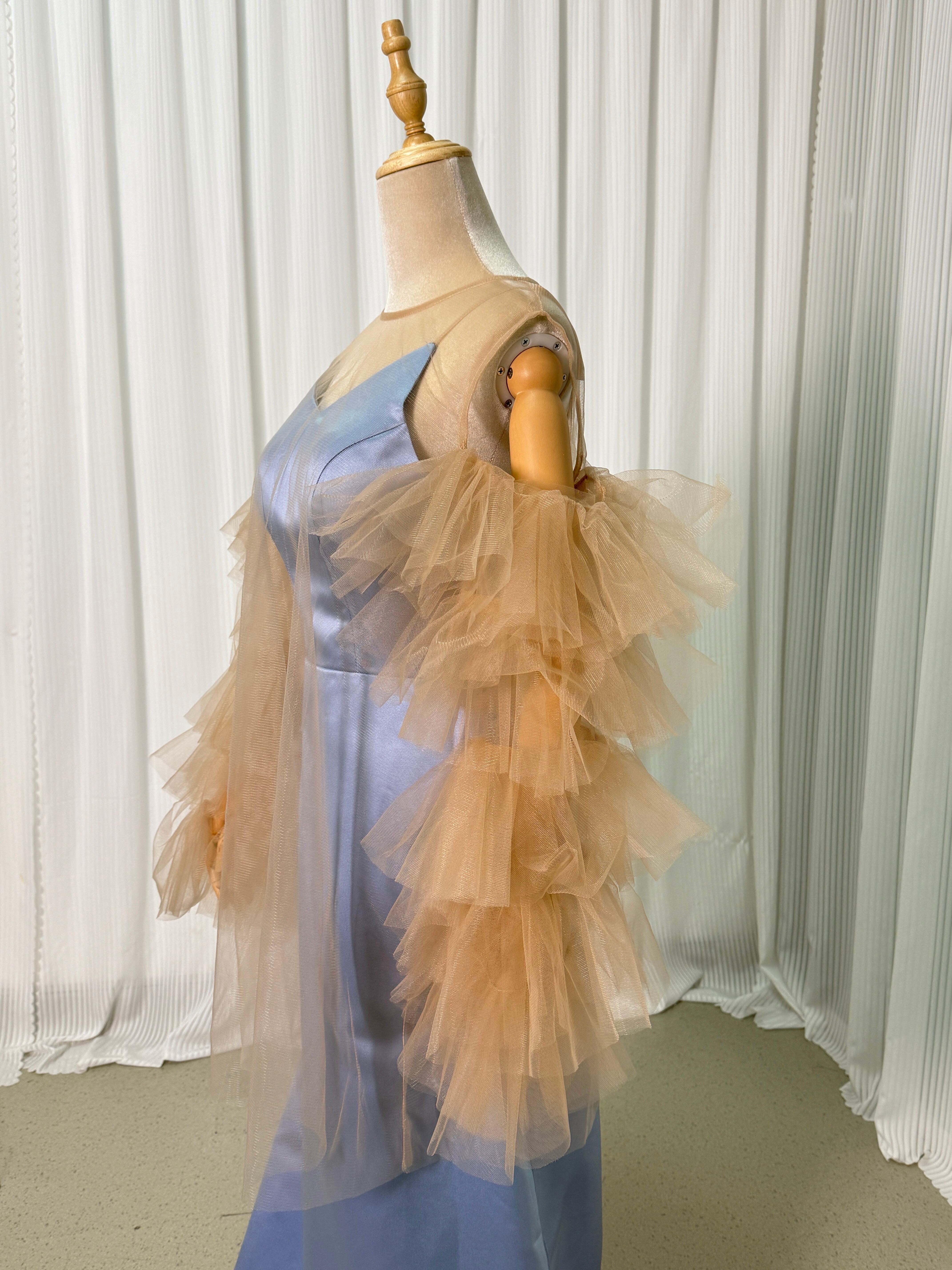 カラードレス ブルー キャミソール+トップス ブラウン フリル袖 光沢サテン 細見えシルエット 前撮り
