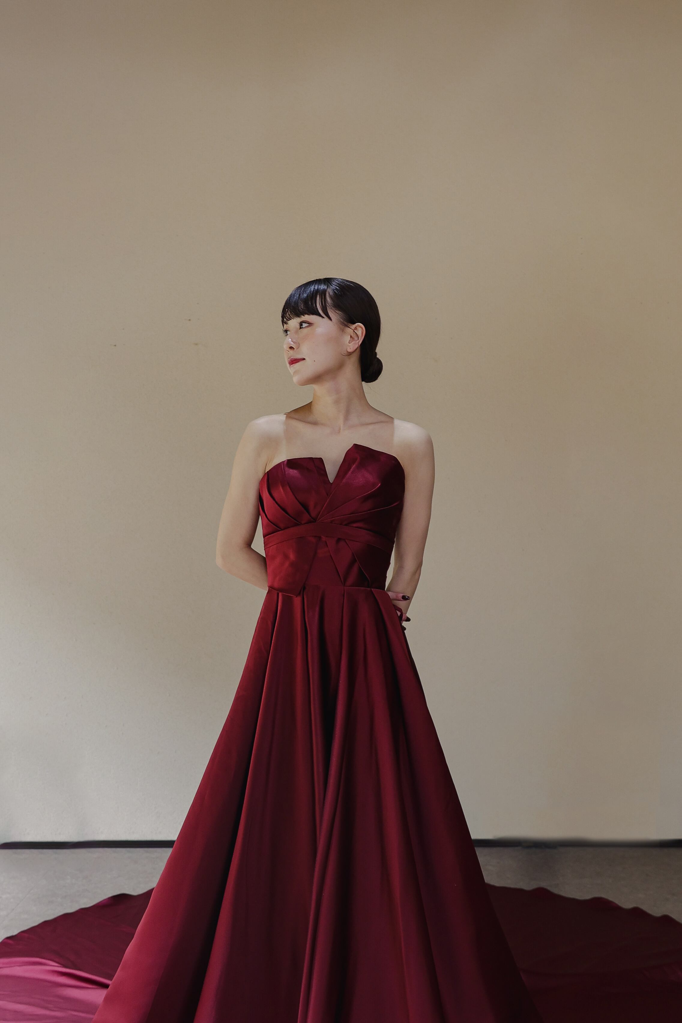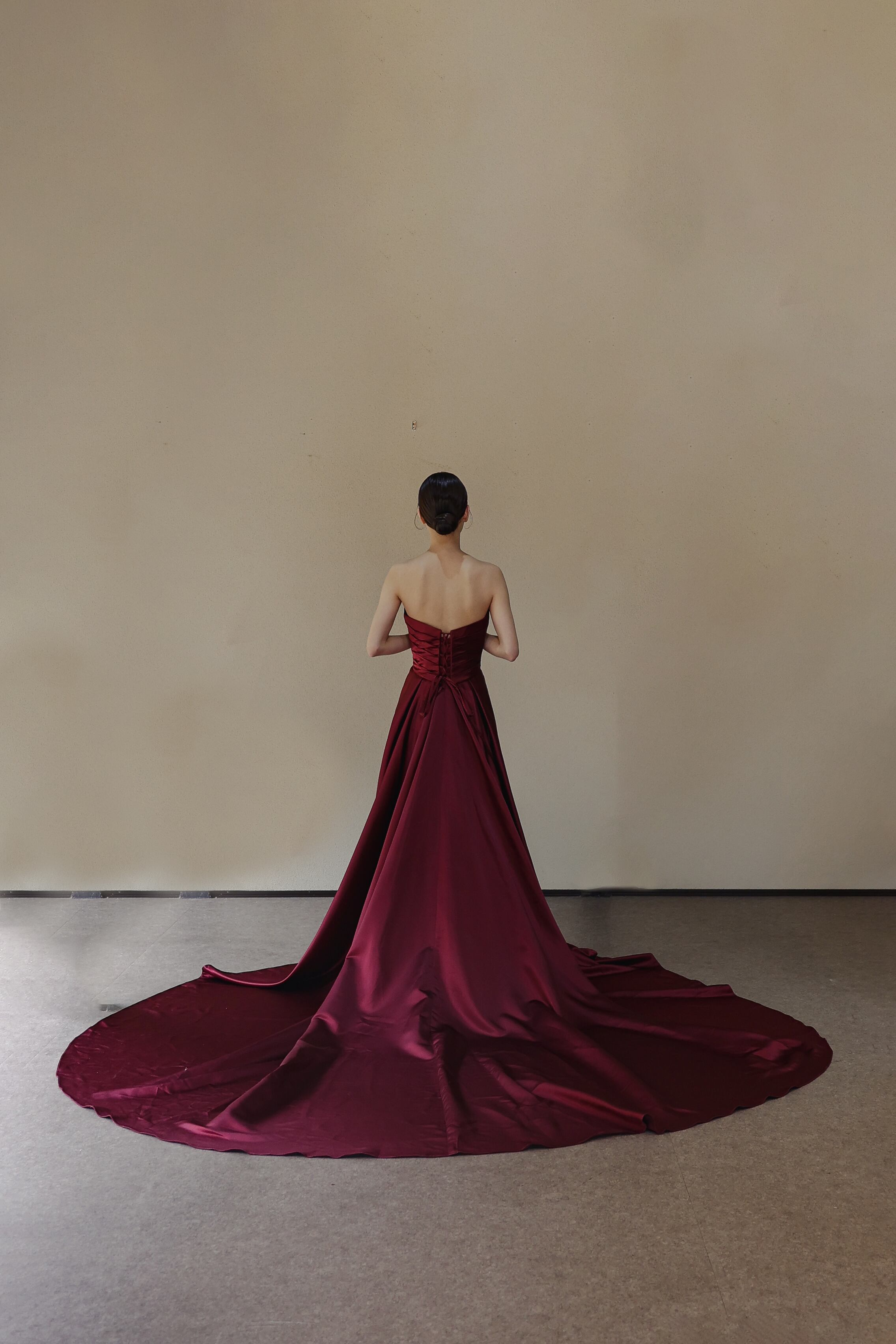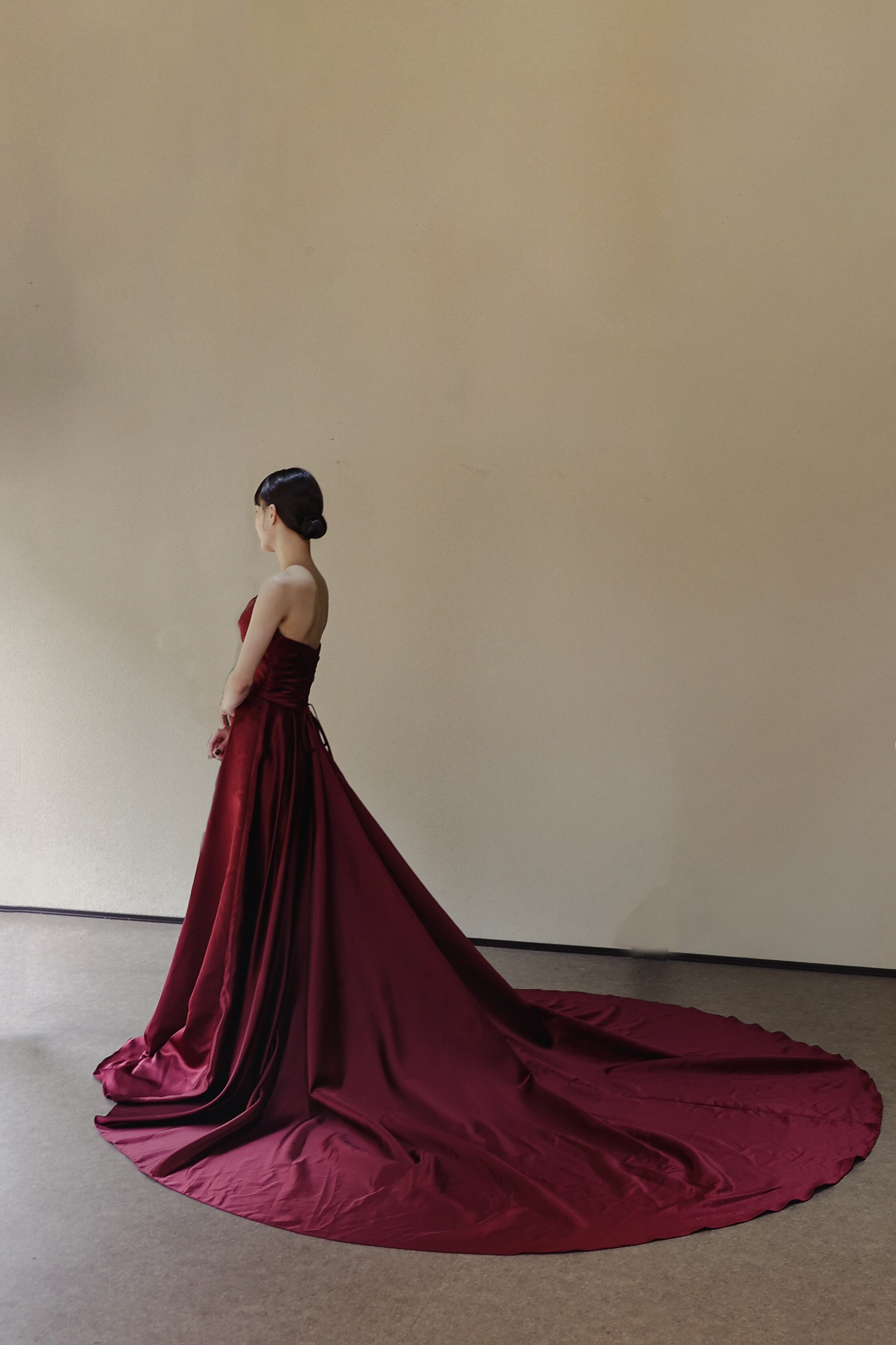 実例写真!カラードレス ベアトップ ボルドー色 光沢サテン 前撮り アンティークなドレス ロングトレーン 花嫁
