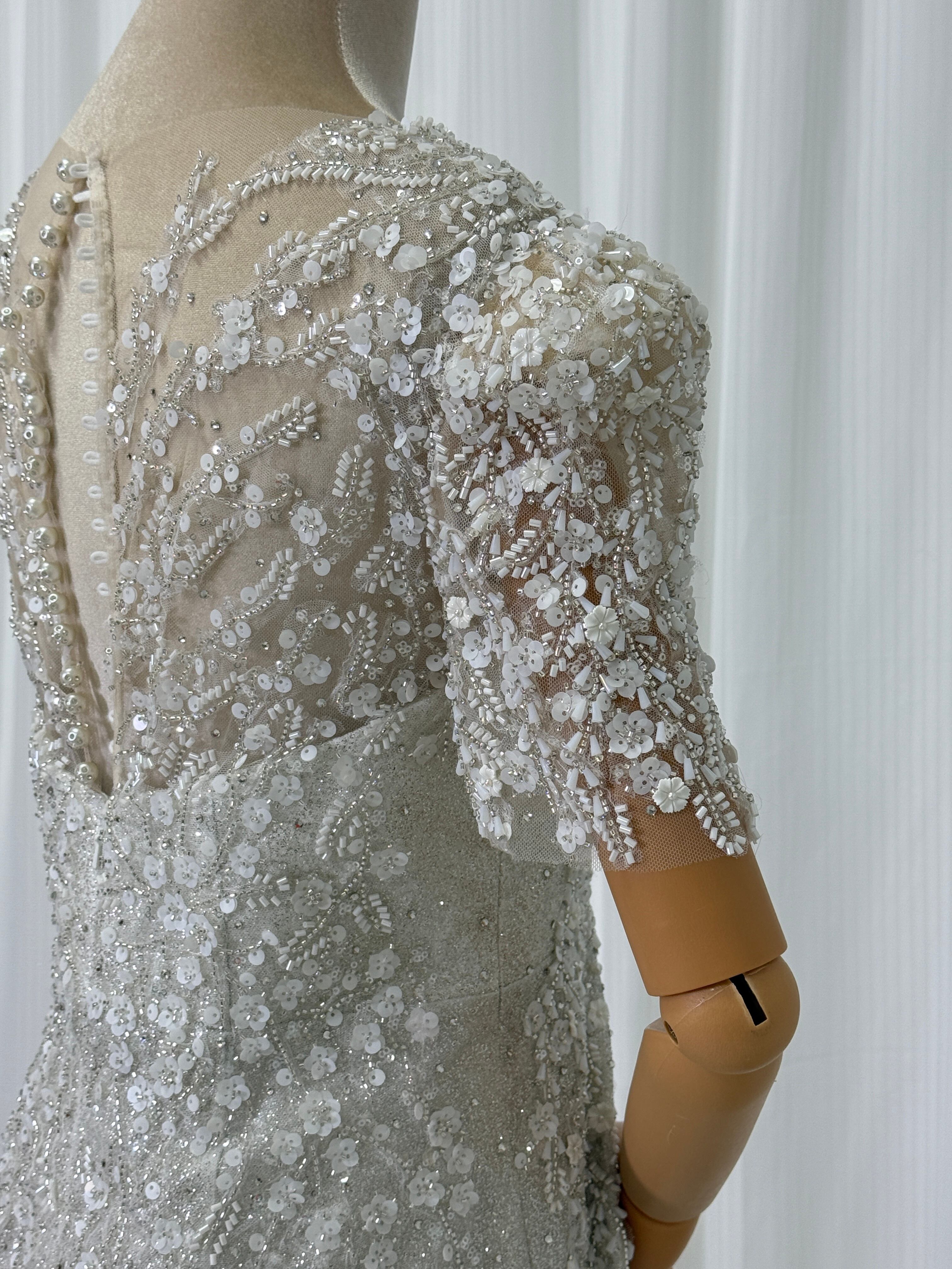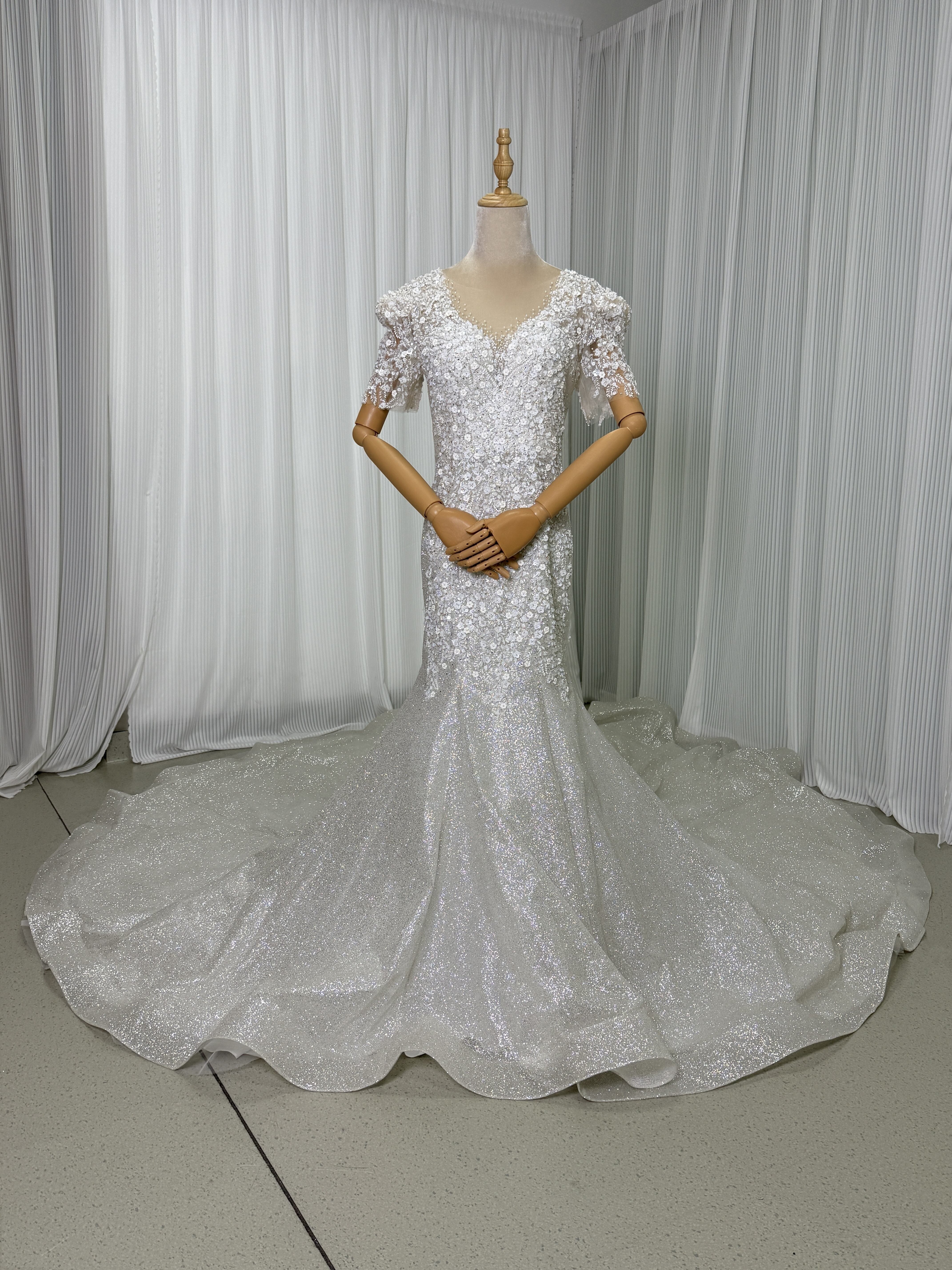 フランス風 ウエディングドレス Vネック 短袖 ビジュー キラキラチュール マーメイドライン ロングトレーン 結婚式