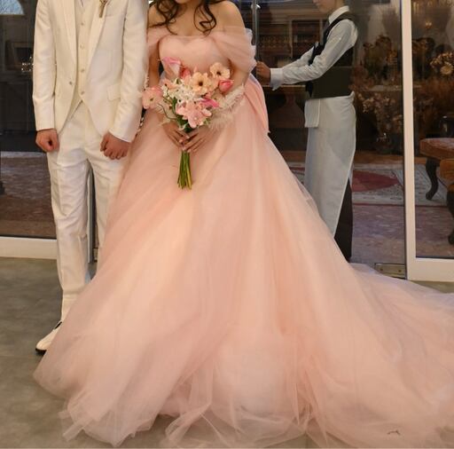 実例写真!薄ピンク カラードレス オフショルダー チュールスカート ふっくら柔らかなバックリボン 花嫁