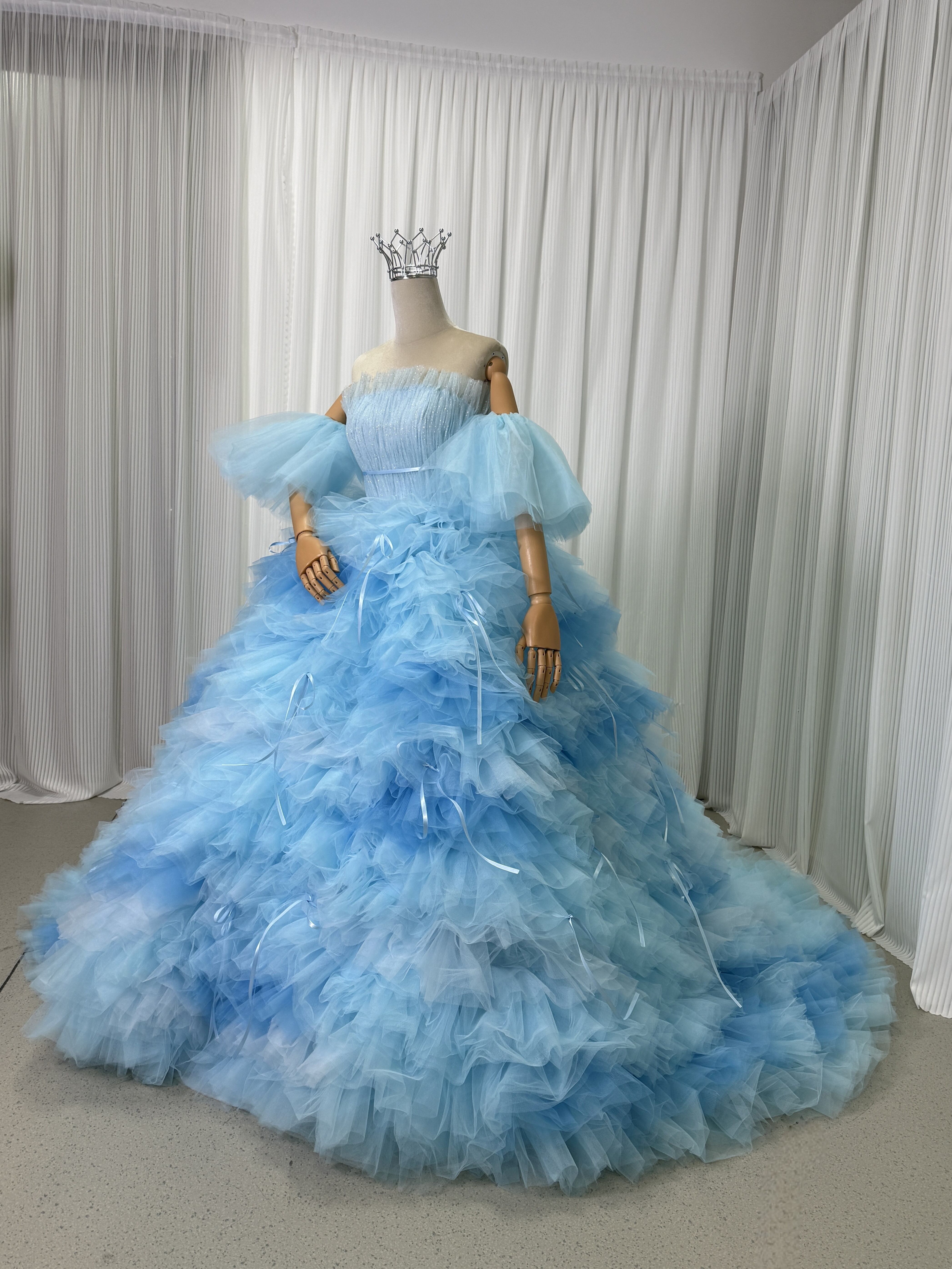 豪華!カラードレス ブルー もこもこドレス リボン 編み上げ 柔らかく重ねたチュールスカート 花嫁