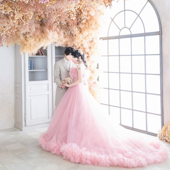 実例写真!カラードレス 薄ピンク オフショルダー ラッフルフリル 結婚式 前撮り 可愛い ロングトレーン
