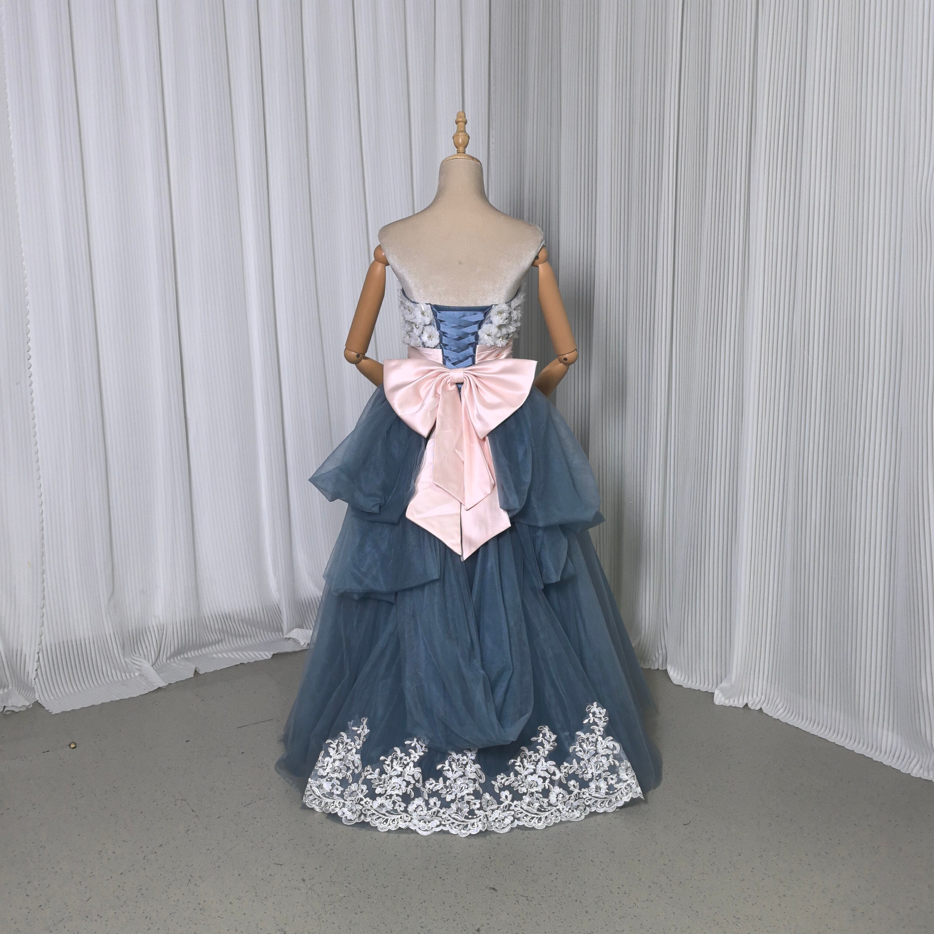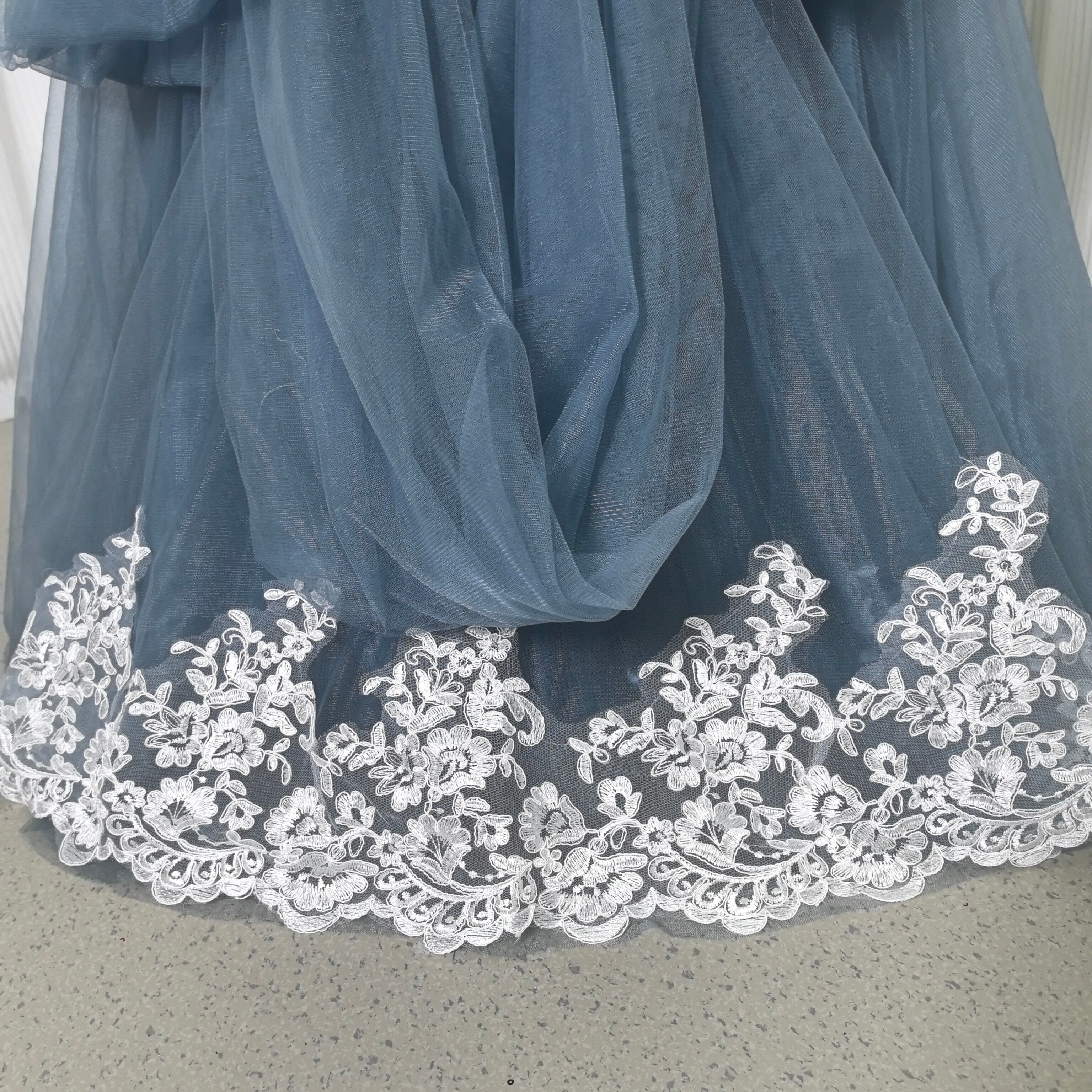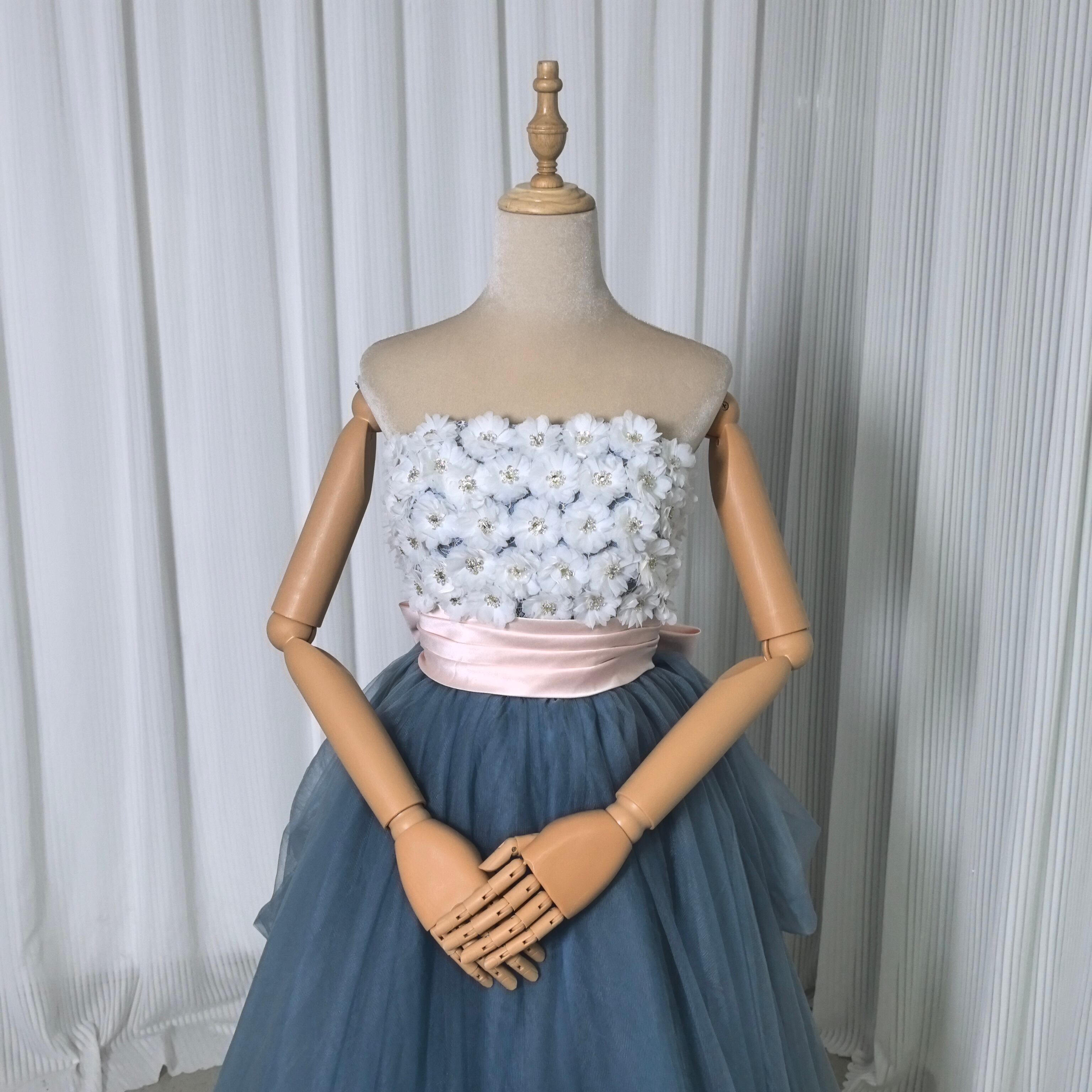 カラードレス ブルーグレー 花モチーフ リボン ロング 裾に繊細レースをあしらった 編み上げ 前撮り