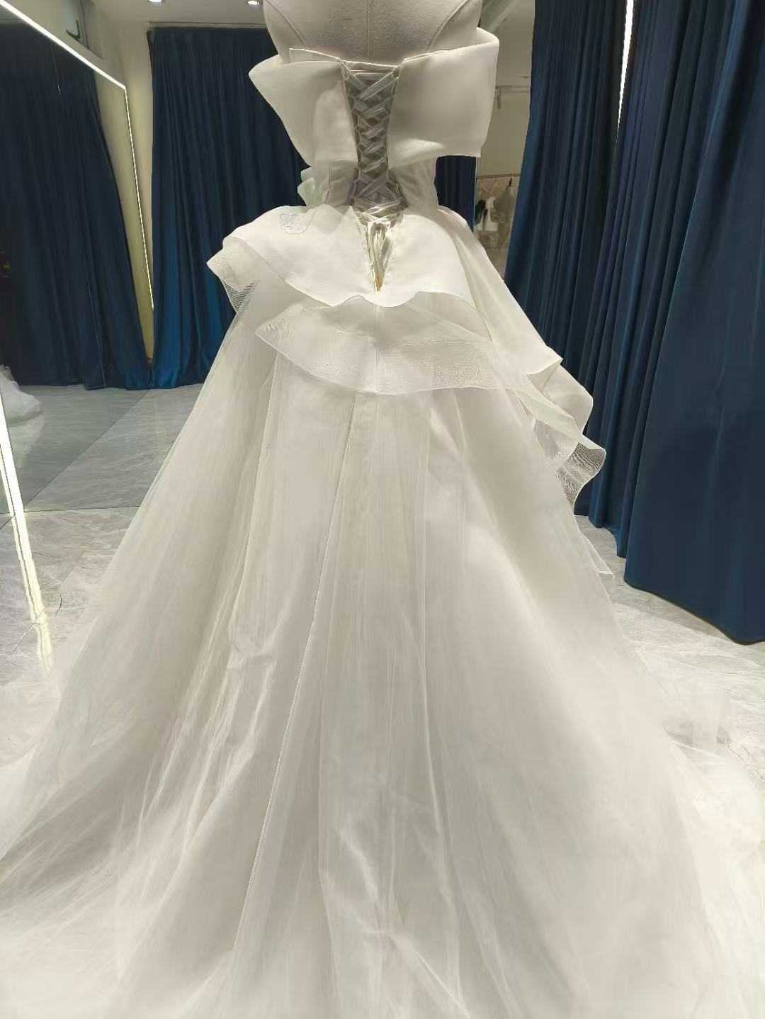 ウエディングドレス 楊柳オーガンジー ベアトップ ラッフルフリル 編み上げ 披露宴