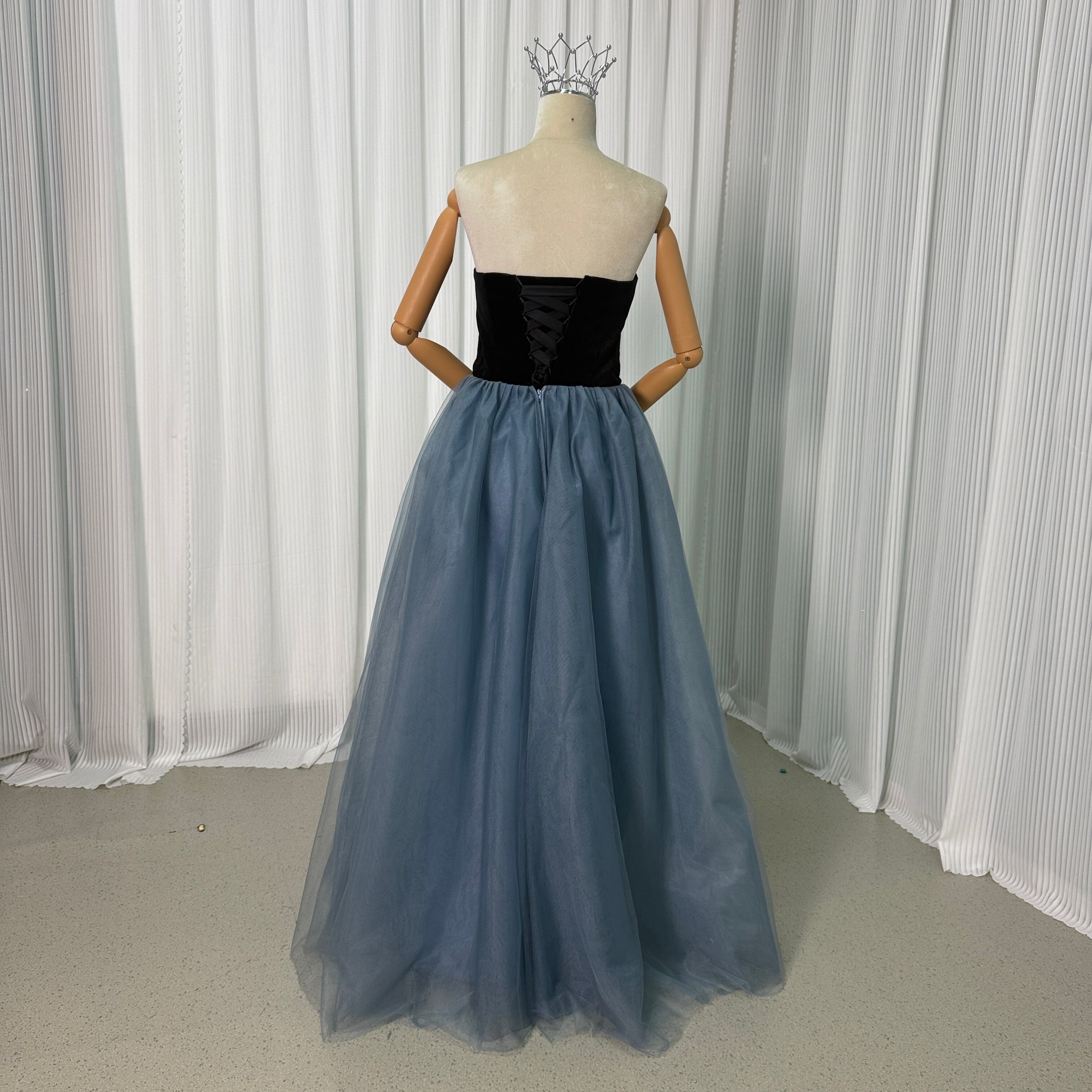 パーティードレス ブルー 黒 ベアトップ ビロード チュールスカート ロングドレス 演奏会/音楽会