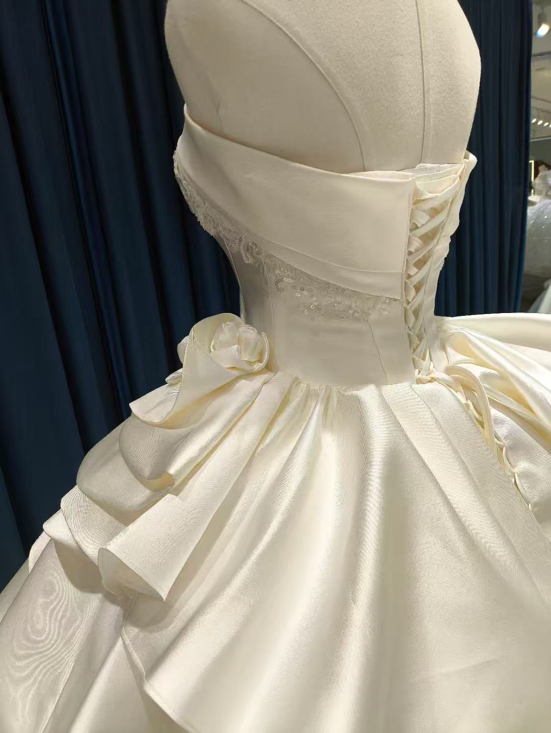 ウェディングドレス ベアトップ ミカドサテン ラッフルフリル 繊細レース 編み上げ 拳式