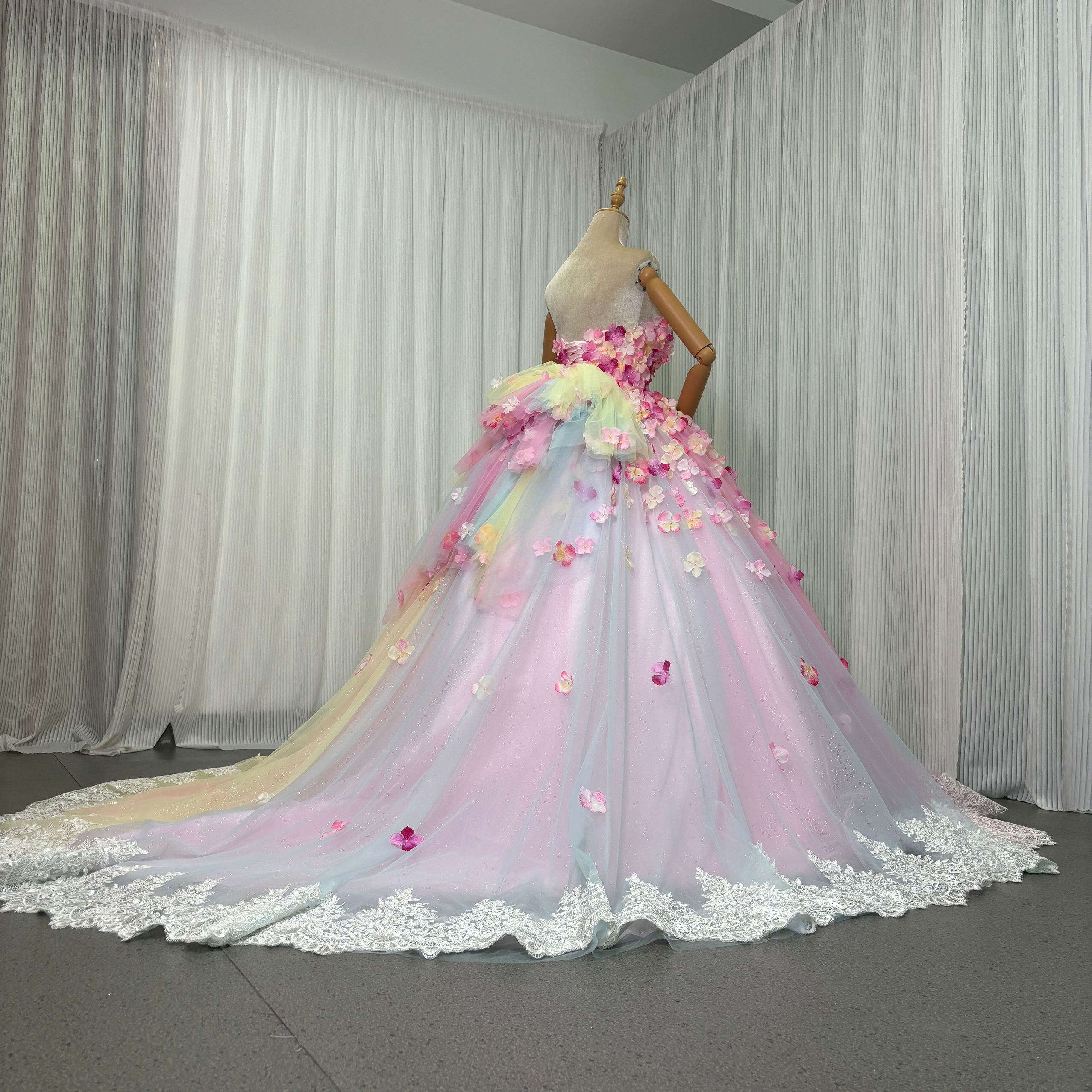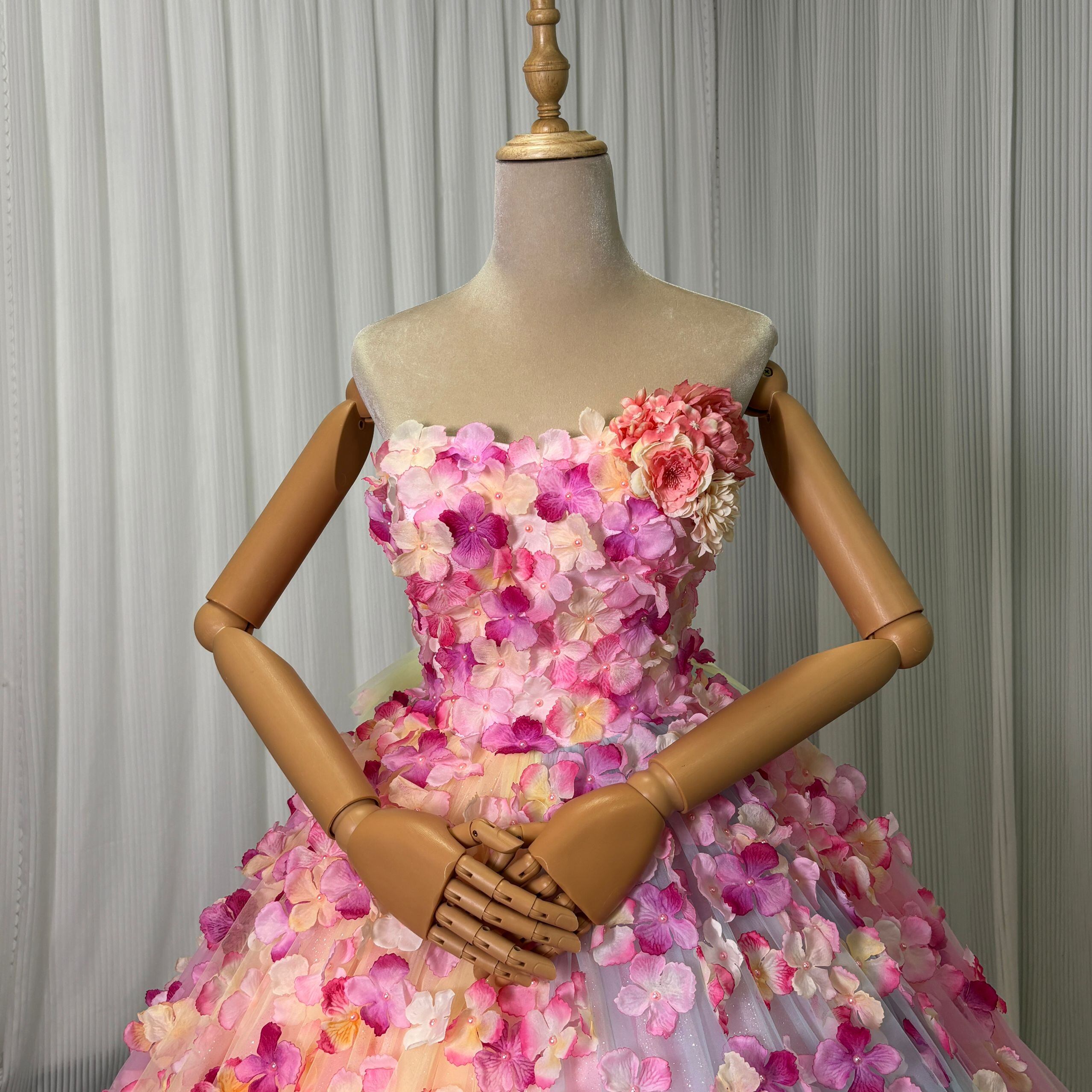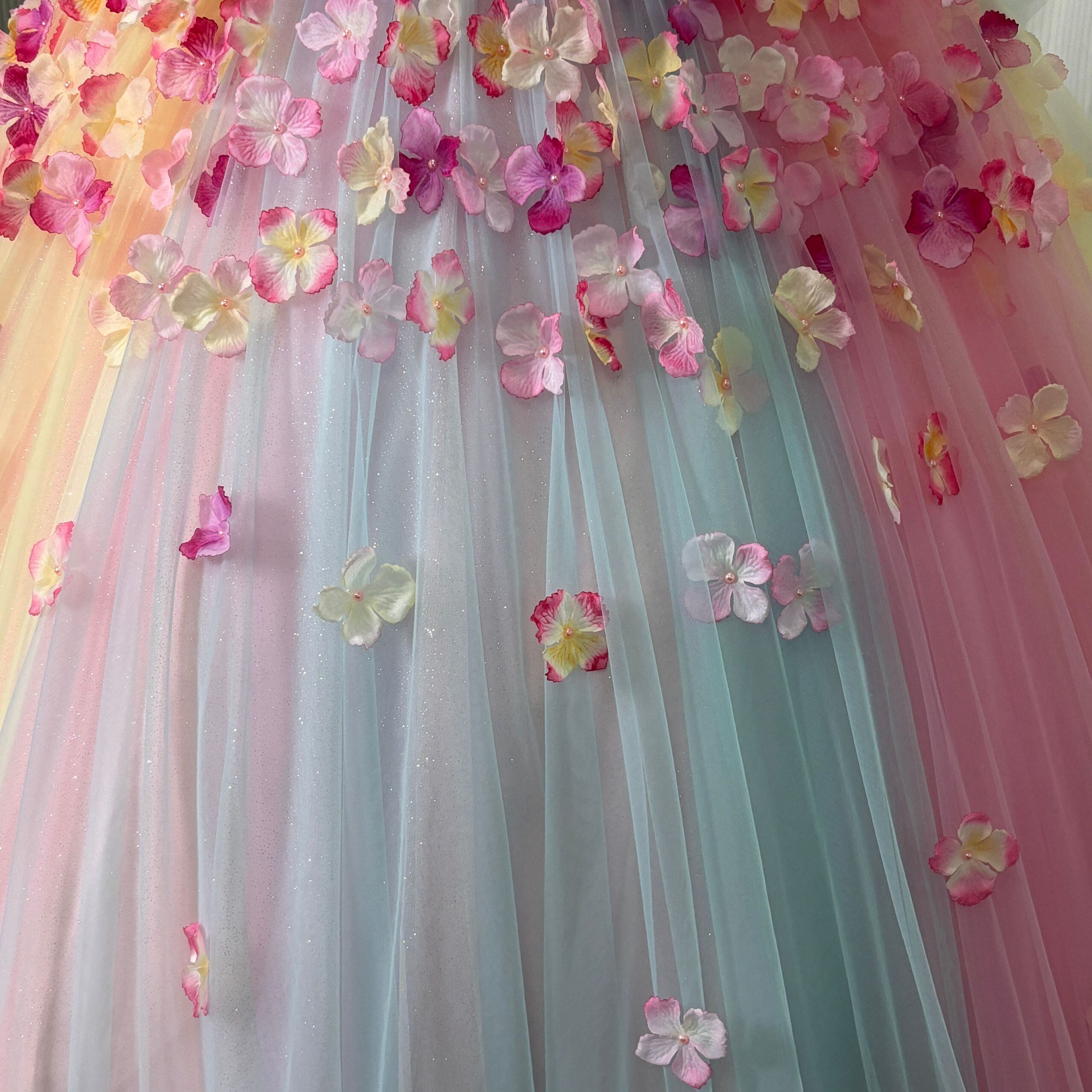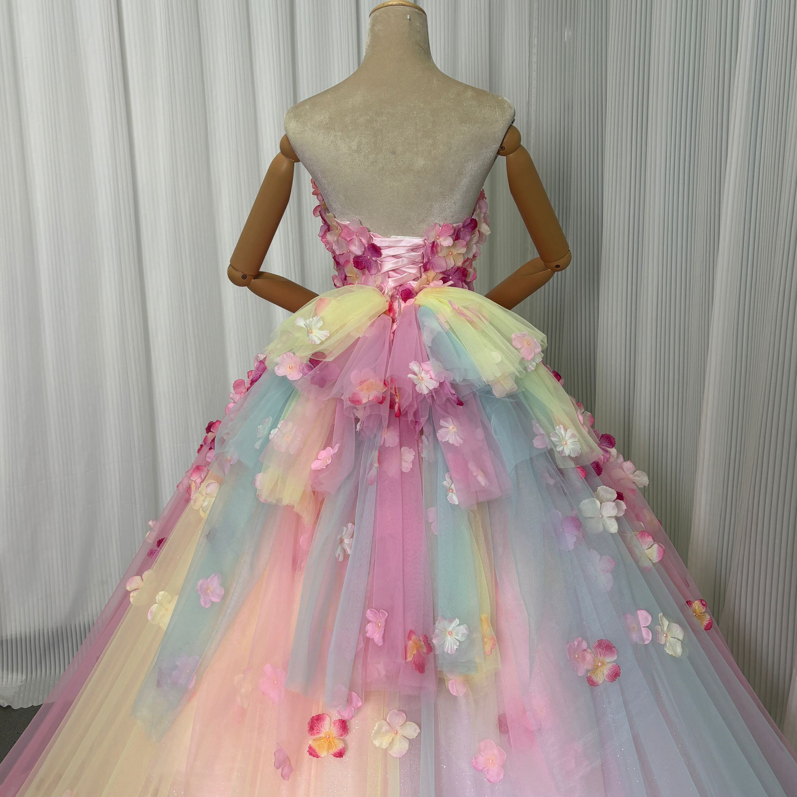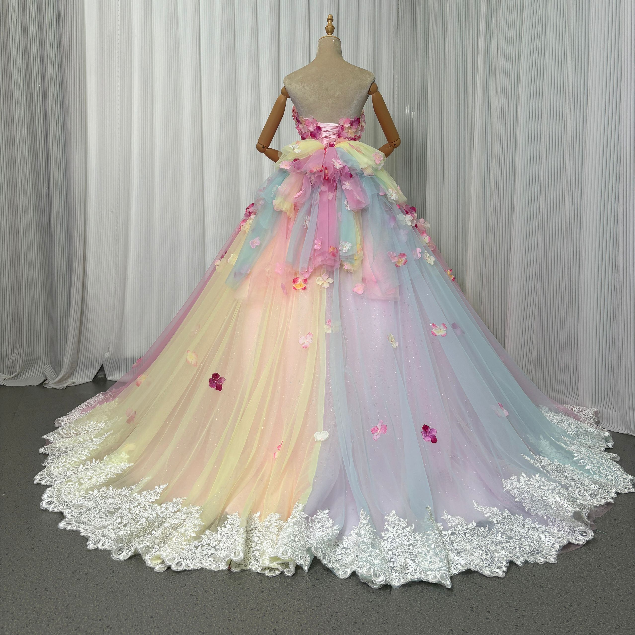 レインボーカラードレス グラデーションピンク 虹色 カラフル キラキラグリッターチュール 編み上げ トレーン お花びら 披露宴