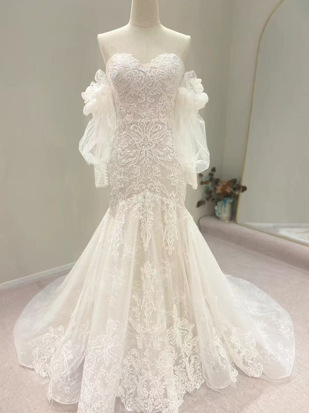 ウェディングドレス ベアトップ 贅沢な総レース ドロップショルダー マーメイドライン 拳式/前撮り