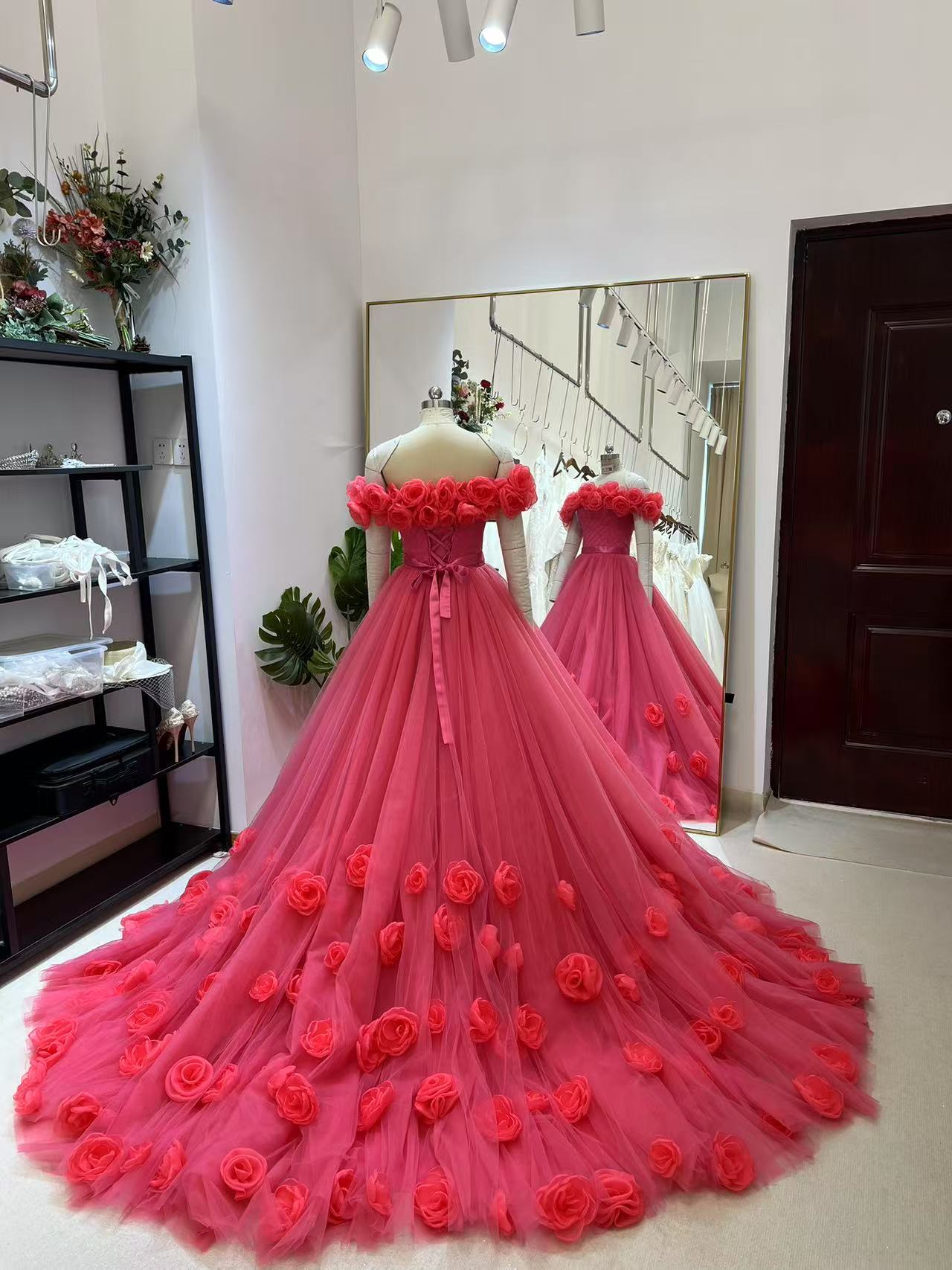 美品!カラードレス オフショルダー バラトレーン ビビッドピンク プリンセスライン ブライダル 可愛い 花嫁