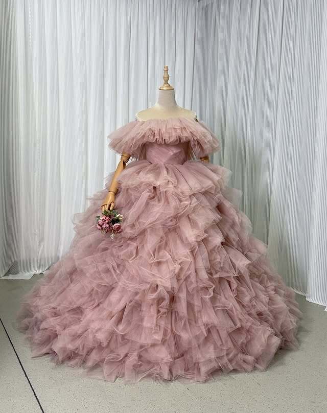 豪華!カラードレス もも色 オフショルダー 編み上げ 取り外し 柔らかく重ねたチュールスカート 花嫁 披露宴