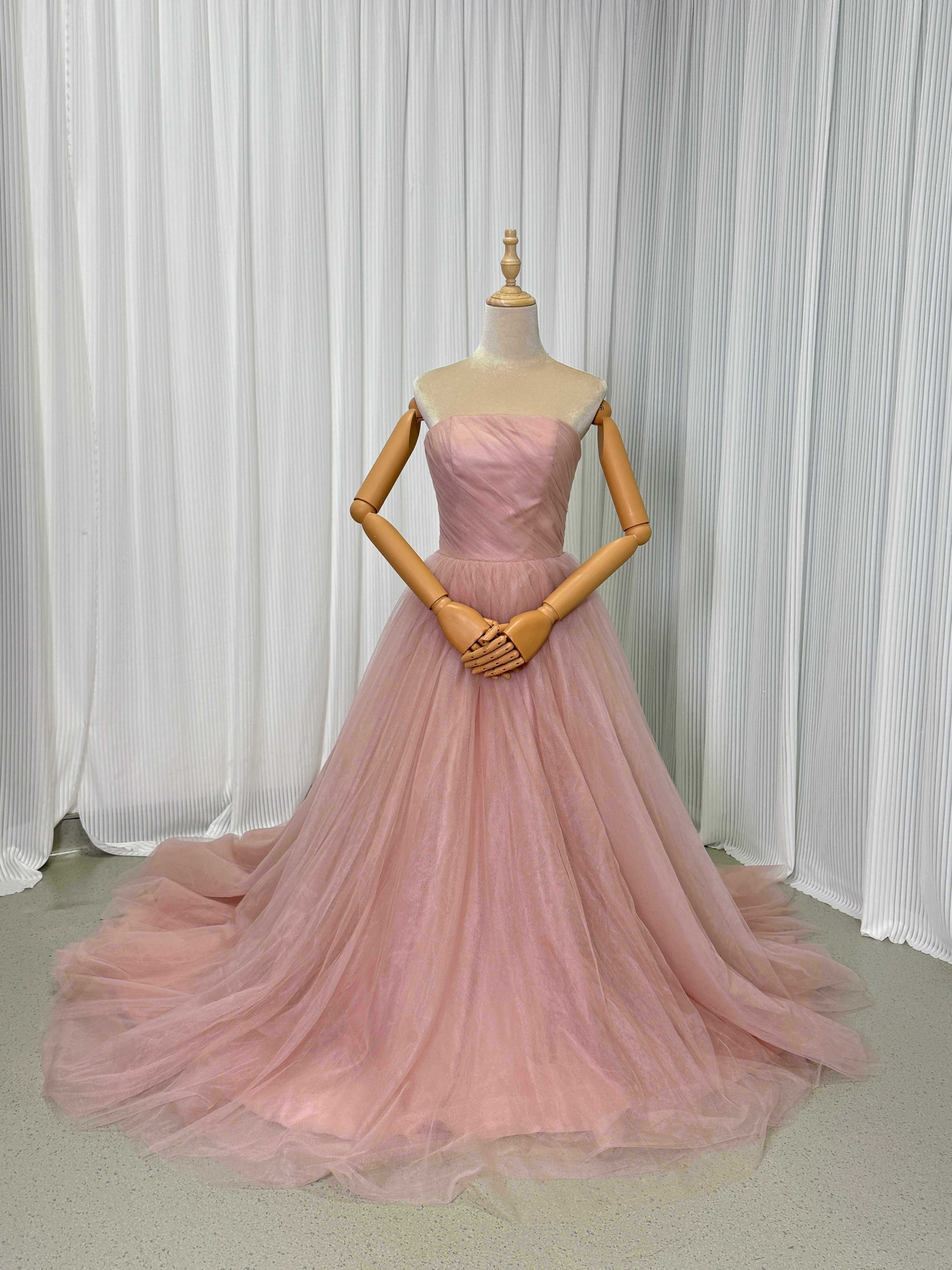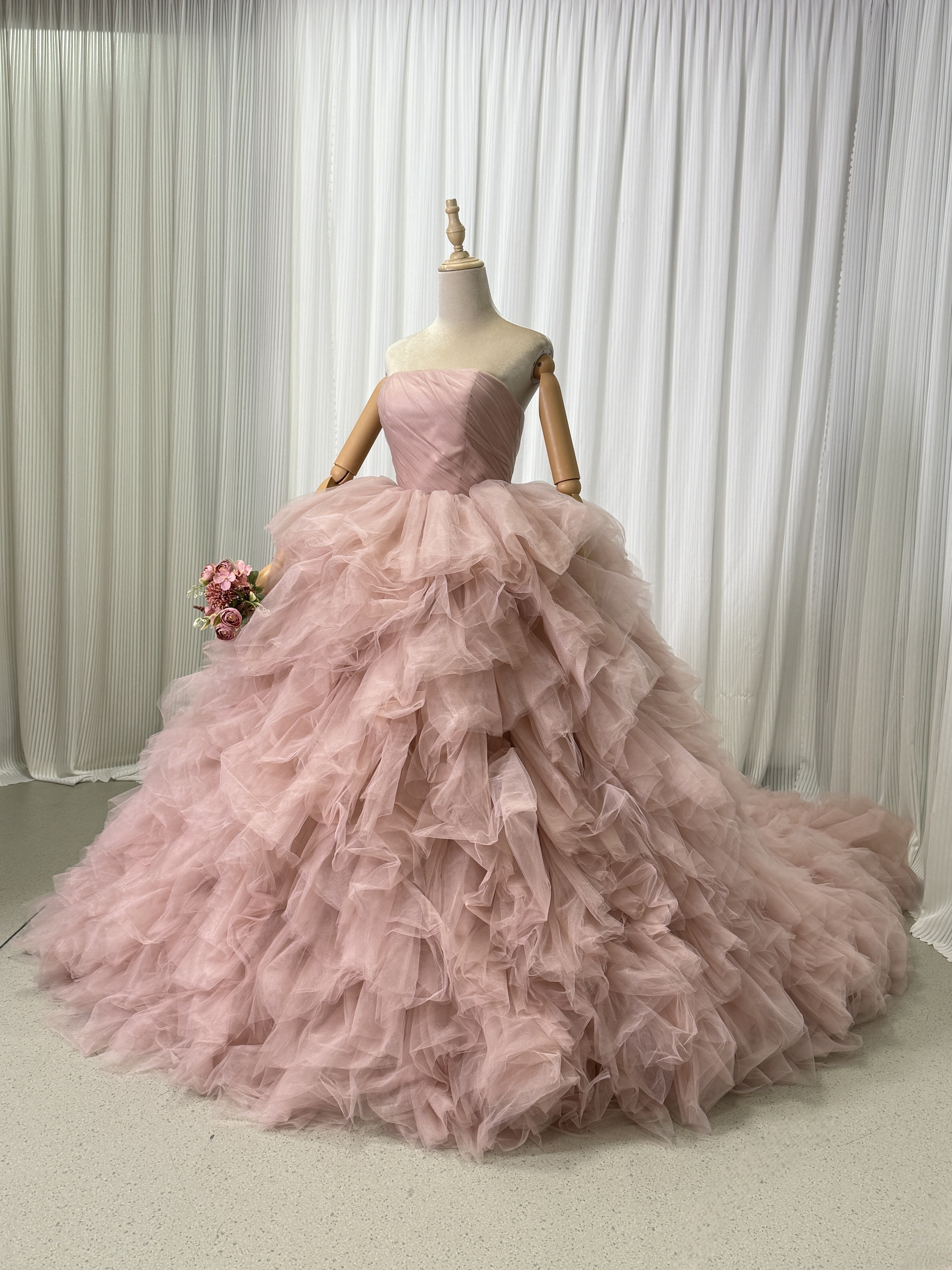 上品!カラードレス もも色 ベアトップ 編み上げ 取り外し 柔らかく重ねたチュールスカート 花嫁 披露宴