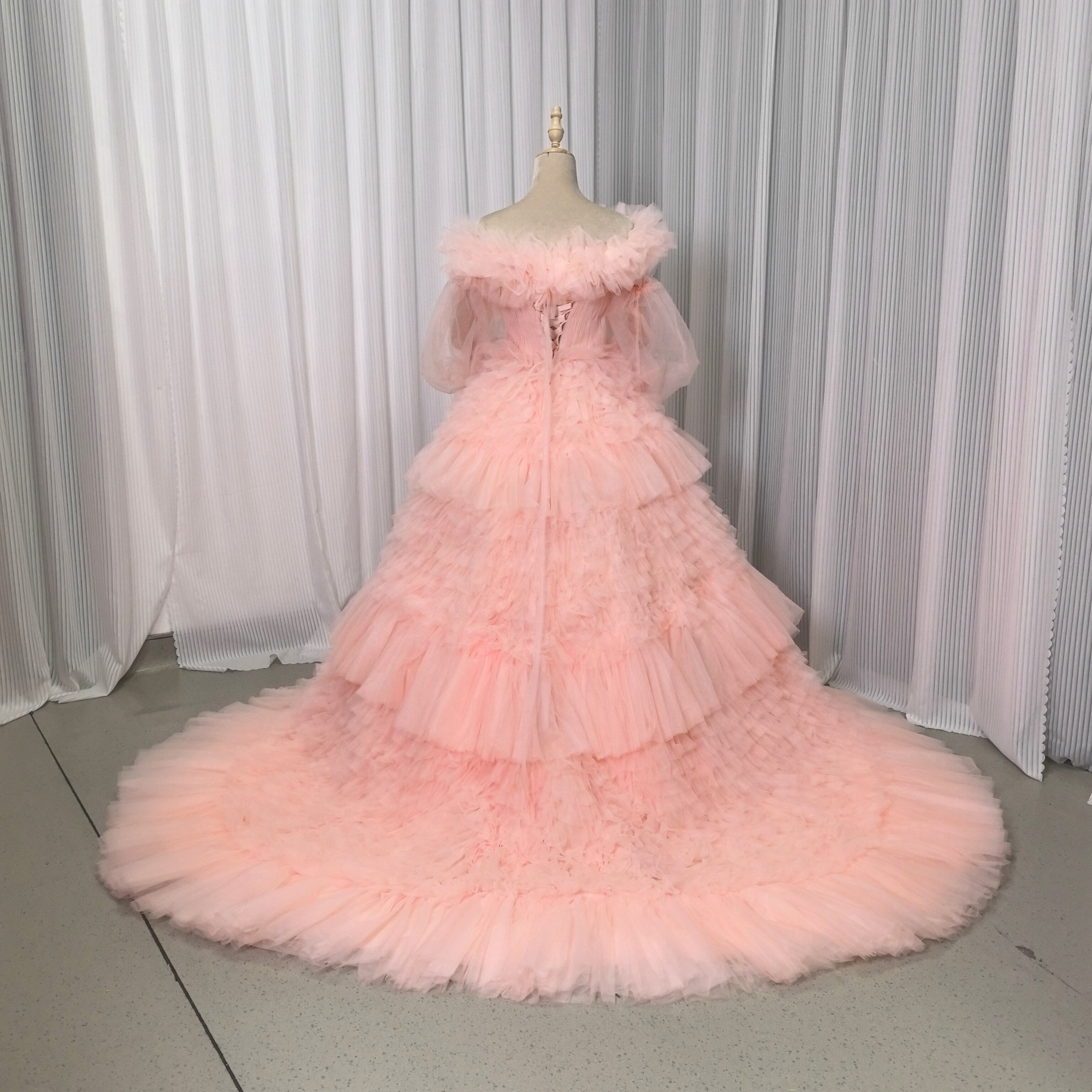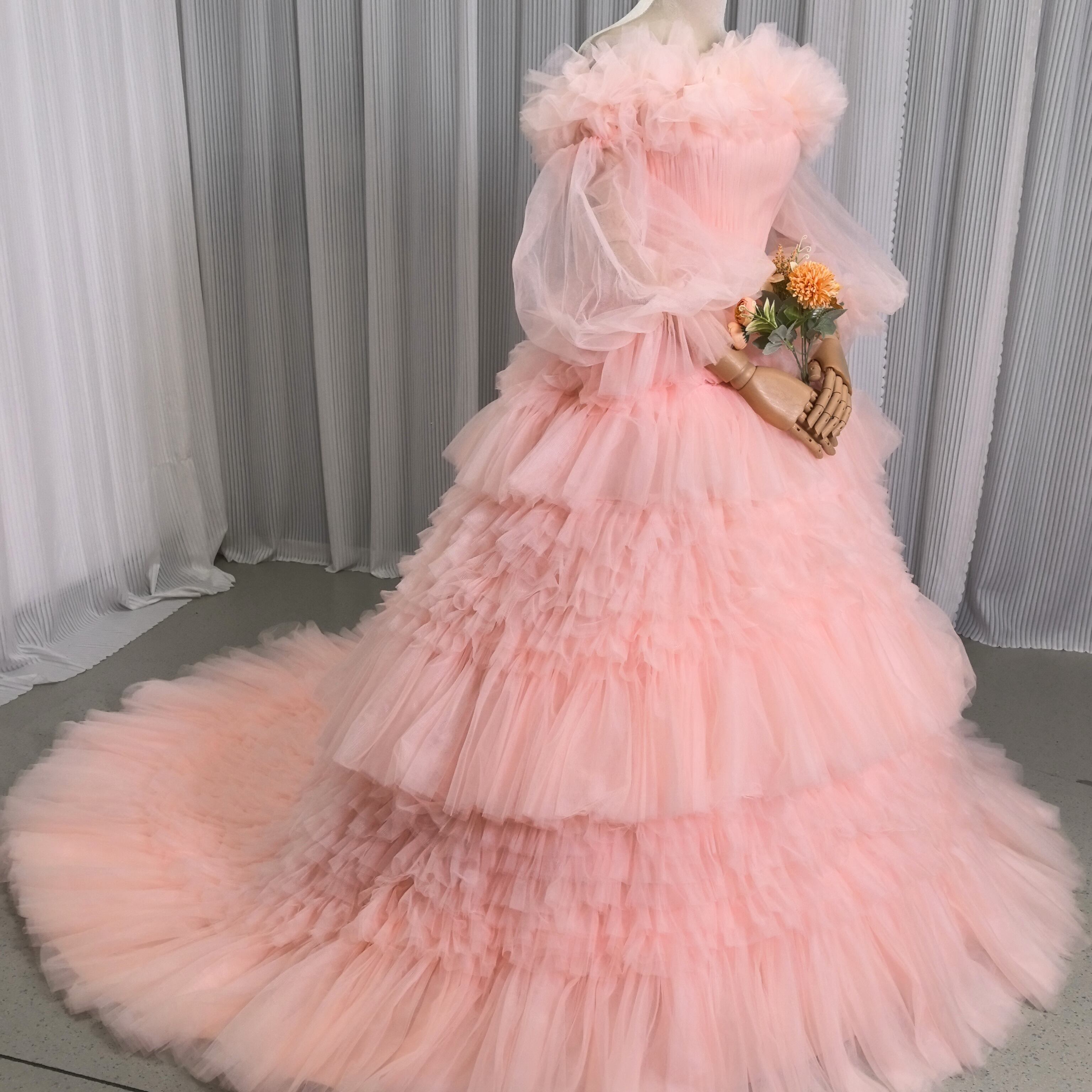 人気上昇!カラードレス 薄ピンク 取り外しオフショルダー ふわふわ袖 フリルドレス チュールドレス 結婚式