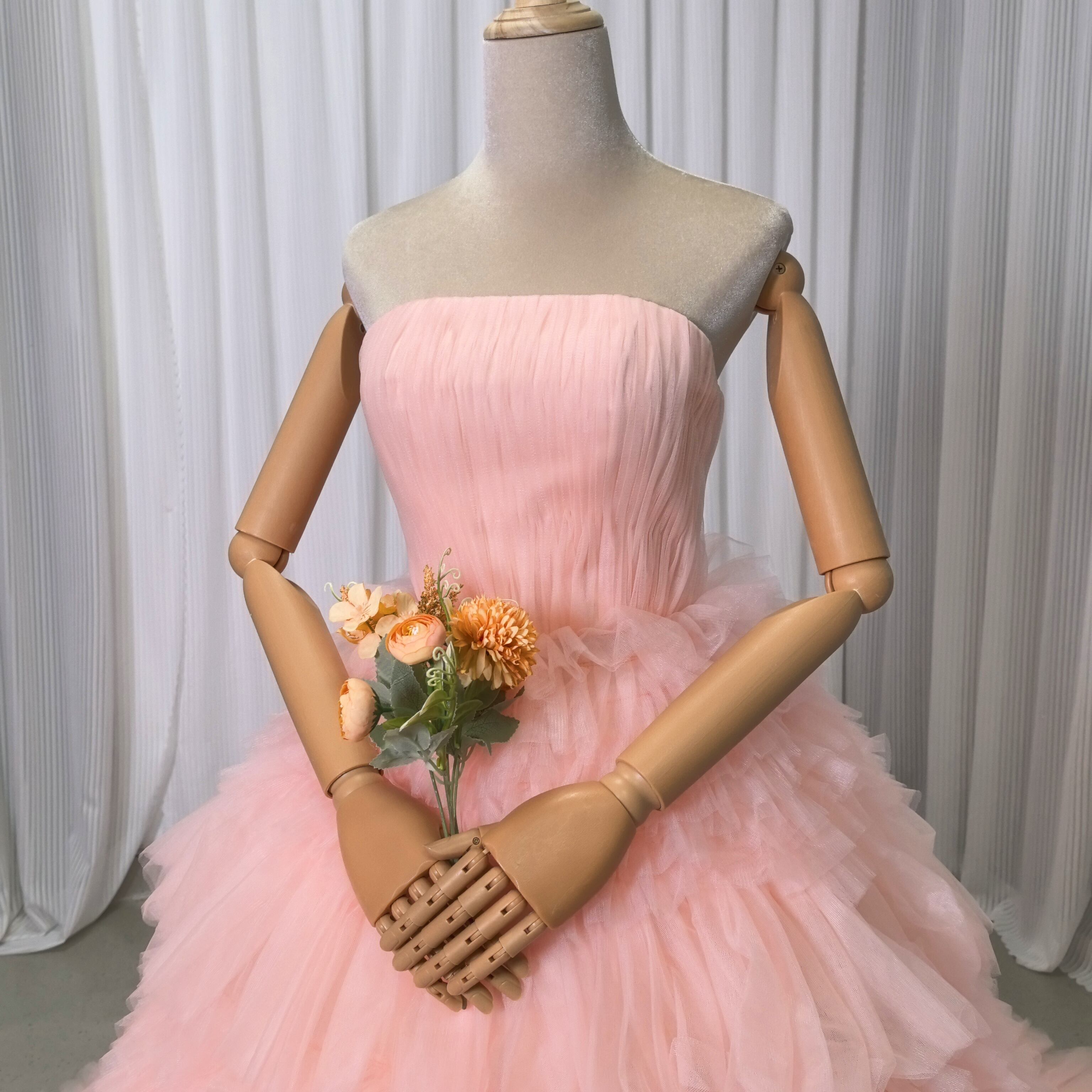 人気上昇!カラードレス 薄ピンク ベアトップ フリルドレス チュールドレス 結婚式