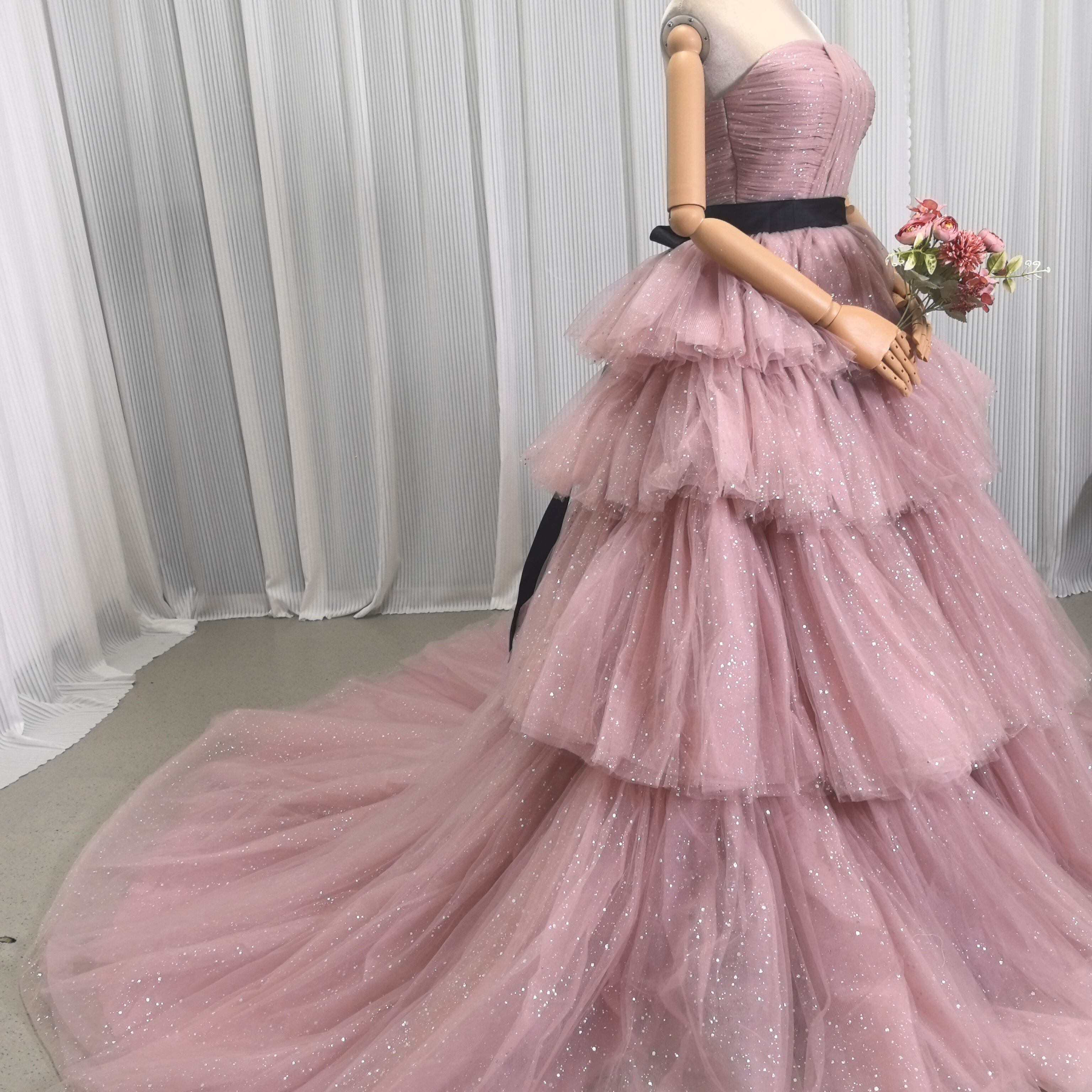 上品!カラードレス ベアトップ ピンク キラキラチュール ベルト 結婚式 ティアードのドレス 花嫁