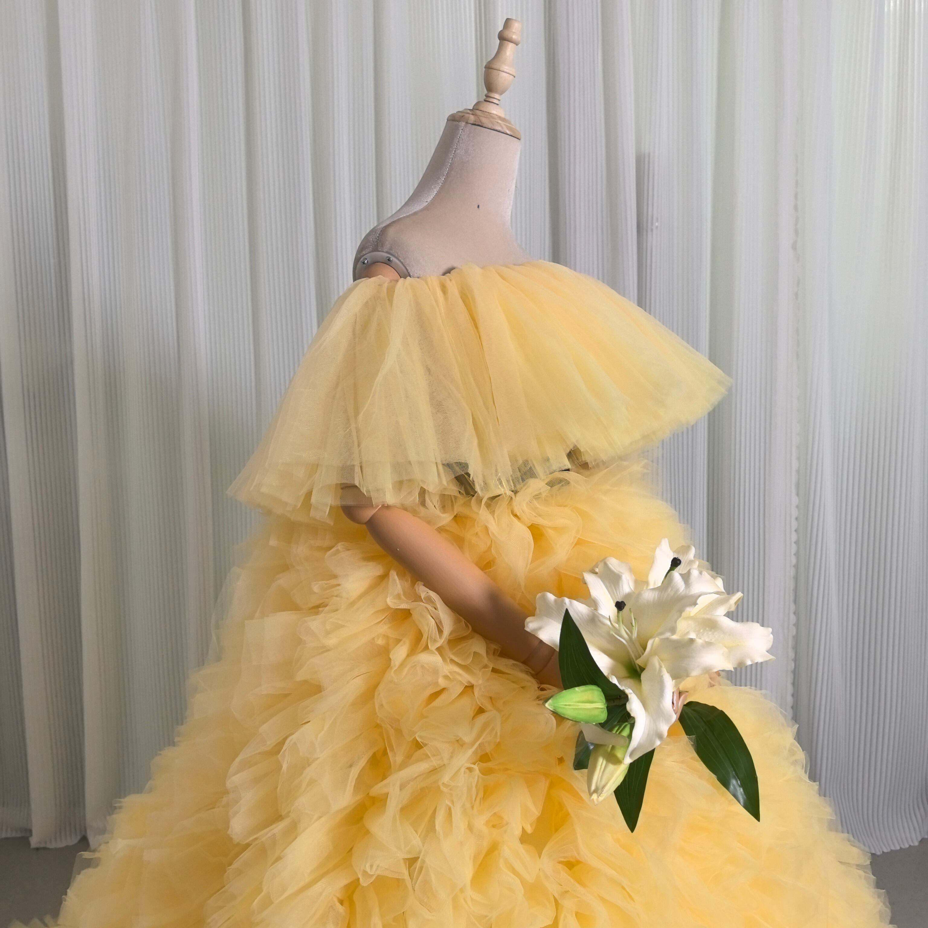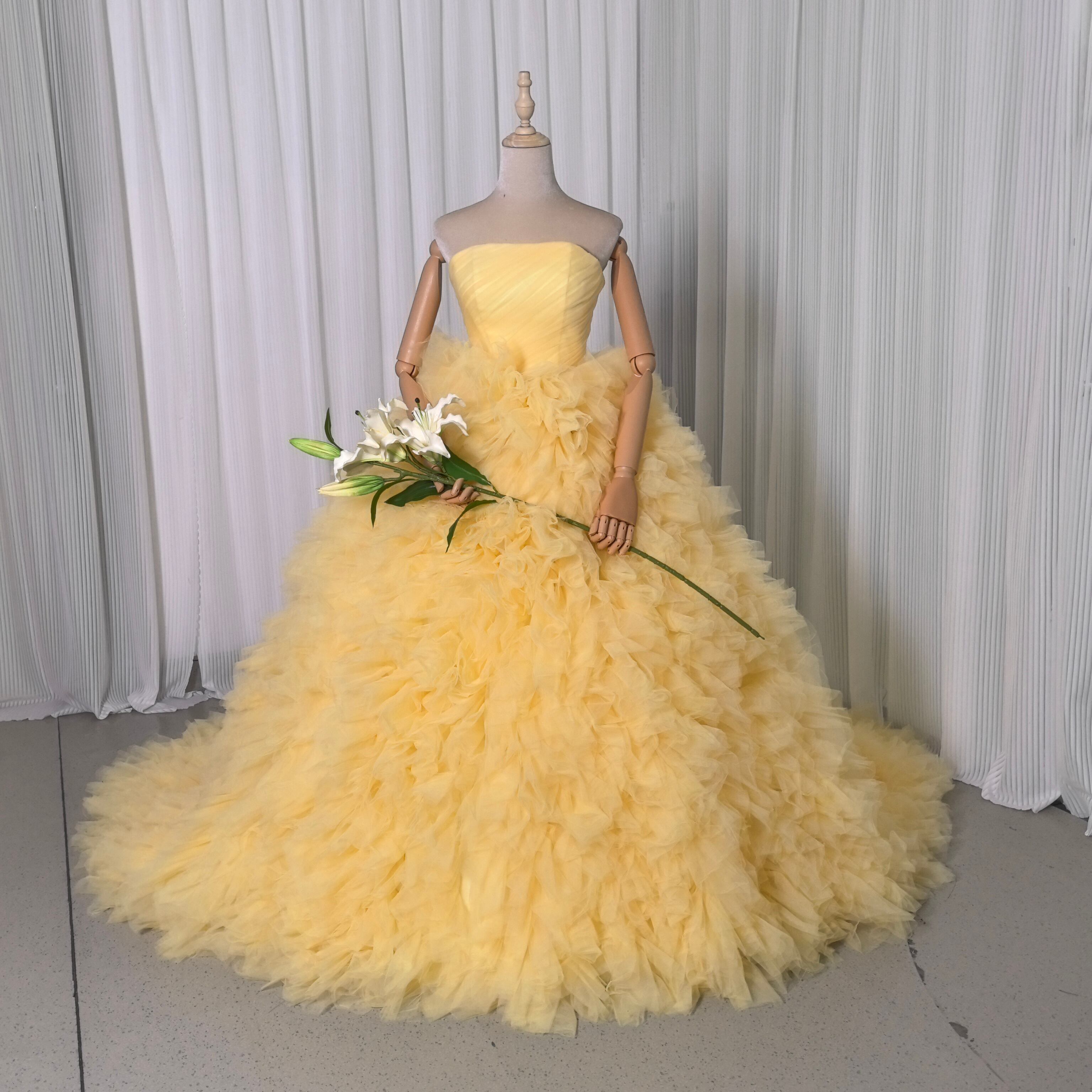 豪華!カラードレス パステルイエロー オフショルダー もこもこドレス 抜群のおしゃれ見え ソフトチュール 花嫁
