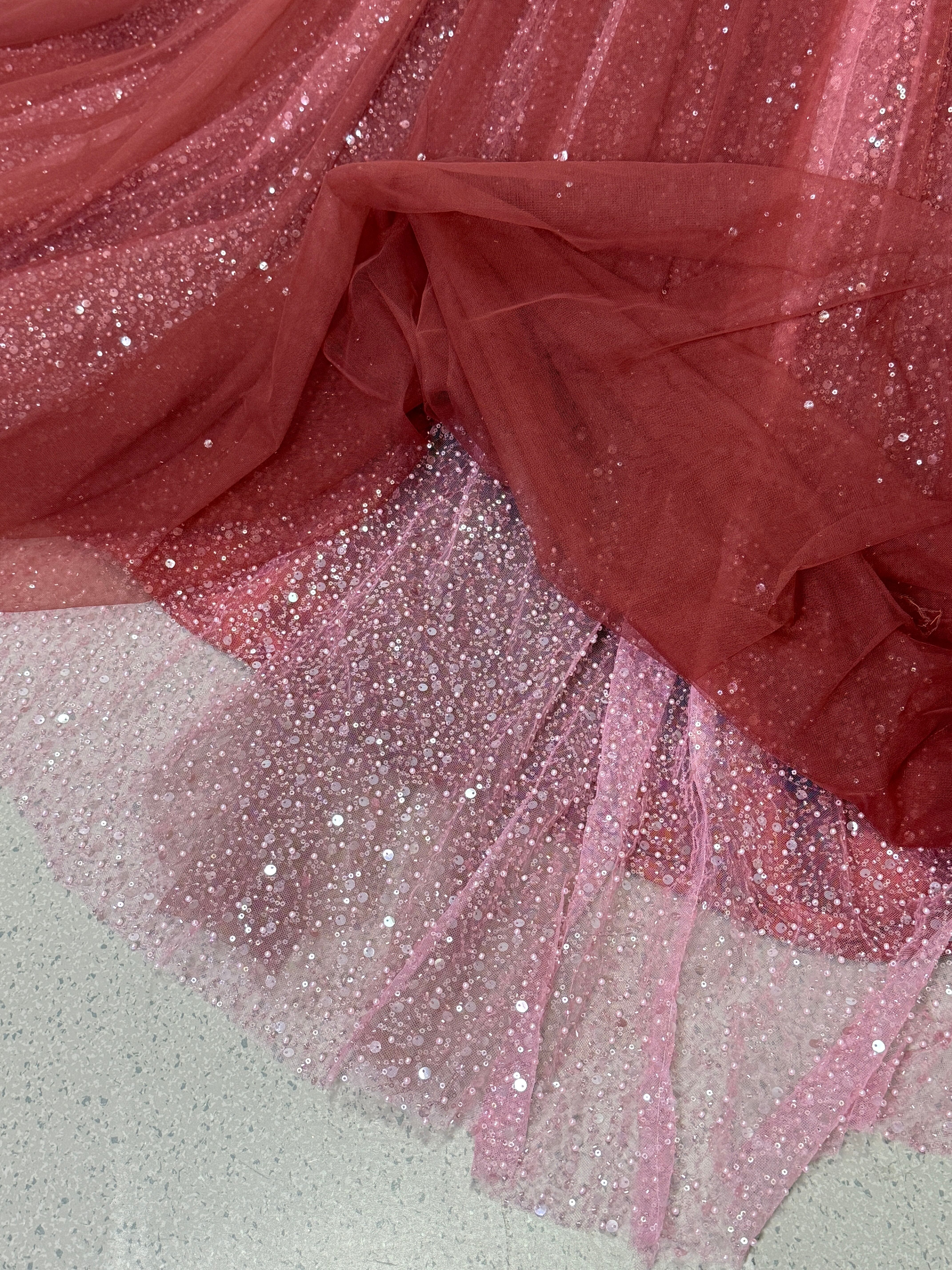 上品!カラードレス ボルドー色 ベアトップ デザイン感 キラキラスパンコール チュールスカート 花嫁