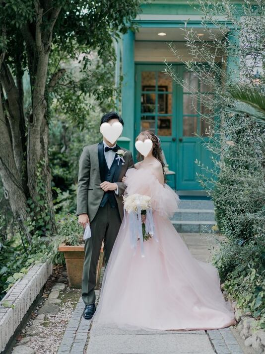 実例写真!薄ピンク カラードレス オフショルダー ソフトチュール 可愛い ふわふわ 披露宴