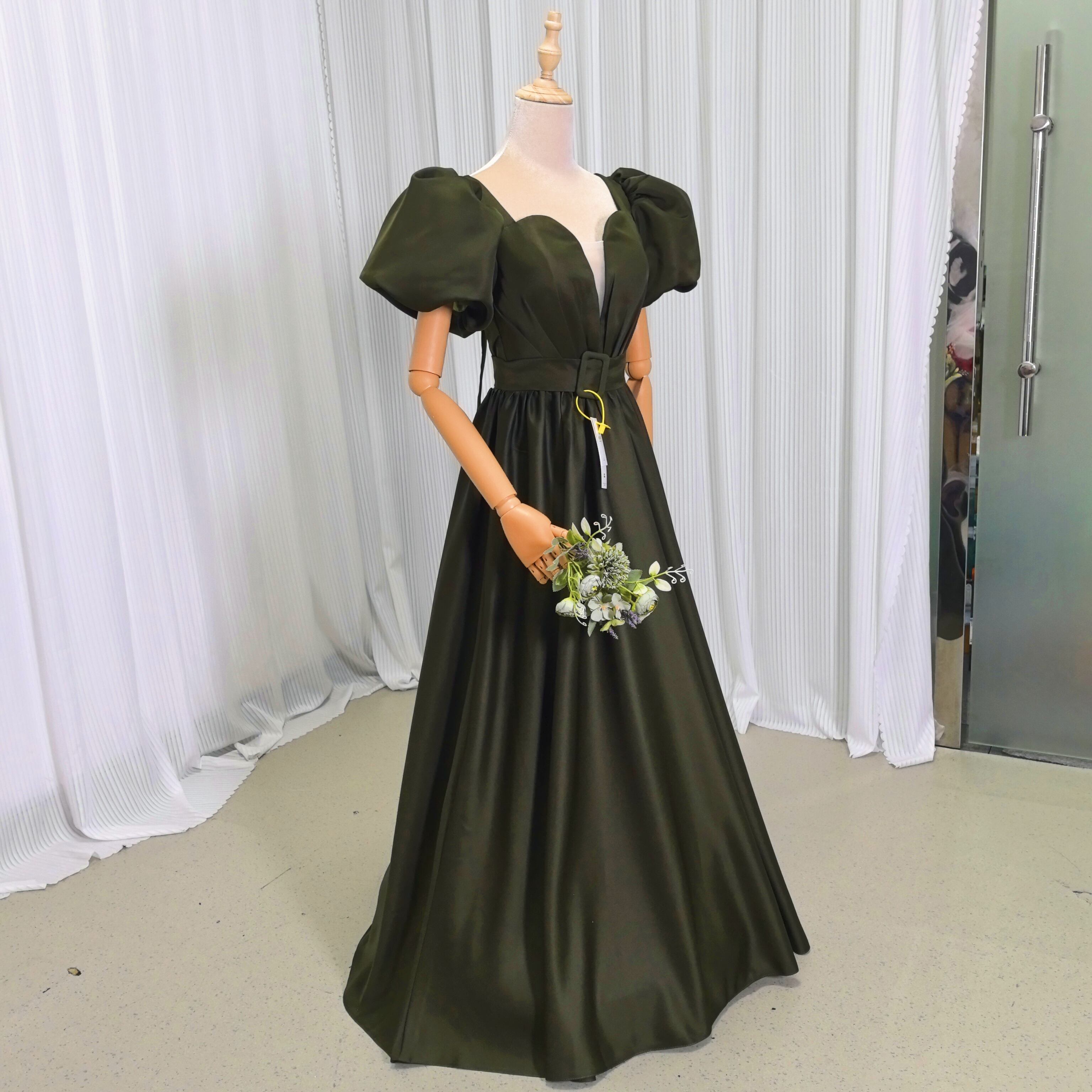 パーティードレス パフスリーブ 深めな緑 Vネック 背中見せ ロング 前撮り 2次会/合コン